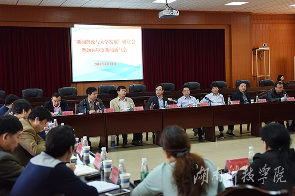 湖南日报永州分社副社长唐善理、红网永州站站长李俊杰、永州日报编辑中心主任欧春涛、永州电视台新闻采编部主任李志刚先后发言,就新闻舆论与高校知名度的提升、与高校立德树人根本任务、与向社会传播正能量的关系;媒体发展态势、媒体融合、“双微”建设;新闻报道的思想性、深度性、可读性、引领性、语言规范性、写作方式的创新性;挖掘先进典型、办好专刊专栏、讲好励志故事、做好新闻策划;加强学校与媒体沟通、人才交流、媒体实践等方面进行了全面深入交流。