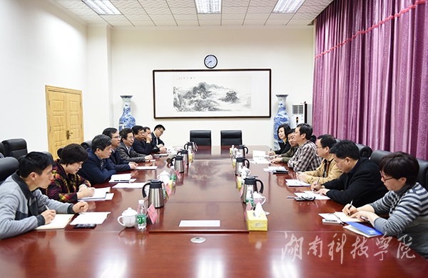 本网讯(实习记者 徐千惠)3月8日上午,怀化学院党委书记谭伟平、党委副书记吴波等一行应邀来校考察交流。校党委书记陈弘热情迎接,双方就人才培养、干部体制改革、财务制度改革等进行深入交流。