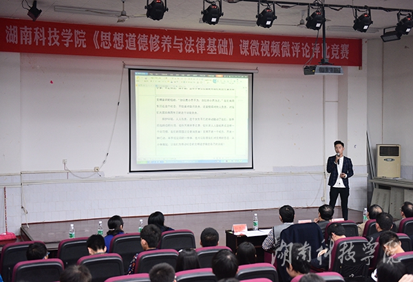 本网讯(记者 裴滢 实习记者 陈林 摄影 何帅文)为深入推动思想政治理论课教学改革,充分发挥思想政治理论课在社会主义核心价值观教育中的主渠道、主阵地作用,增强大学生对社会主义核心价值观的认同,11月23日晚,由马克思主义学院主办的《思想政治教育与法律基础》课微视频微评论大赛在vwin德赢博雅楼东三教室举行。