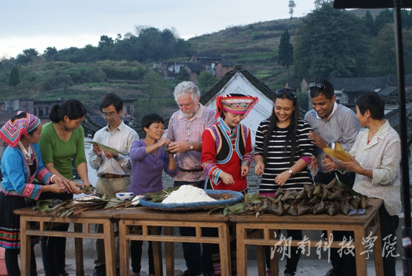 在宁远县九嶷山景区,外籍教师饶有兴趣地了解了舜帝南巡的故事和治理以德的事迹,他们纷纷为与他相关的孝感天地、勤政为民、斑竹滴泪的故事感慨不已。在舜帝雕像前,外籍教师们恭敬地朝拜舜帝,同时也为自己的家人和亲朋祈福。中午,外籍教师一行来到美丽恬静的宁远县城,走进文庙,外籍教师们一边驻足观看各类精美石雕,一边认真听取导游讲解,感受文庙在中国儒文化传播中所起到的重要作用。下午,外籍教师一行来到古村落小桃源村,参观了这个具有400年历史的古村落,并与村民一起进行包粽子的民俗活动,受邀参加村里举行的长桌宴,感受淳朴的民风和传统的节日氛围,深切体验到中国农耕文化的特色。