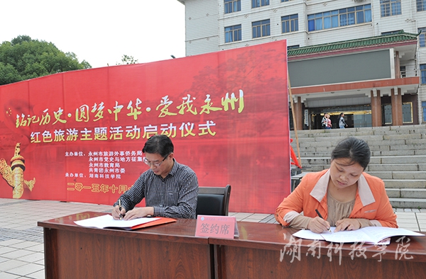 副校长宋宏福、程智开分别代表学校与祁阳浯溪碑林风景名胜区签署合作框架备忘录,接收“永州红色旅游研究基地”牌匾。