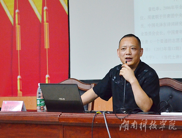讲座伊始,曾松亭向同学们介绍到,“毛泽东曾写过一首题为《七律·答友人》的诗,今天,我们就来细细了解这位“友人”——一位伟大的革命家、科学家乐天宇的人生故事。”曾松亭联系当年的时代背景,从“九嶷山人“、“农学风波”、“谁是友人”三部分将乐天宇的传奇人生向大家娓娓道来。当他告诉同学们,乐天宇这名毛泽东的特殊“友人”,是近代以来最早走进农业科学领域的知识分子,是最早投身到历史洪流中的革命家,他还用国家补发的工资回家乡办起了新中国第一所民办“大学”时,同学们纷纷报以热烈掌声。随后,他畅谈志愿精神,分享了其在青年志愿者工作中的思考与感悟。
