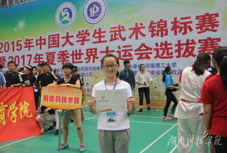 本网讯 7月17日至7月21日,由中国大学生体育协会主办的“2015年中国大学生武术锦标赛暨2017年夏季世界大学生运动会选拔赛”在河南理工大学举行。体育学院学生江珂获女子“龙身蛇形”太极拳铜牌,并被确定为“2017年世界大学生运动会”候选队员,这是vwin德赢在全国体育竞赛中奖牌“零”的突破,也是湖南省高校历史上参加全国武术竞赛的第三次夺牌。