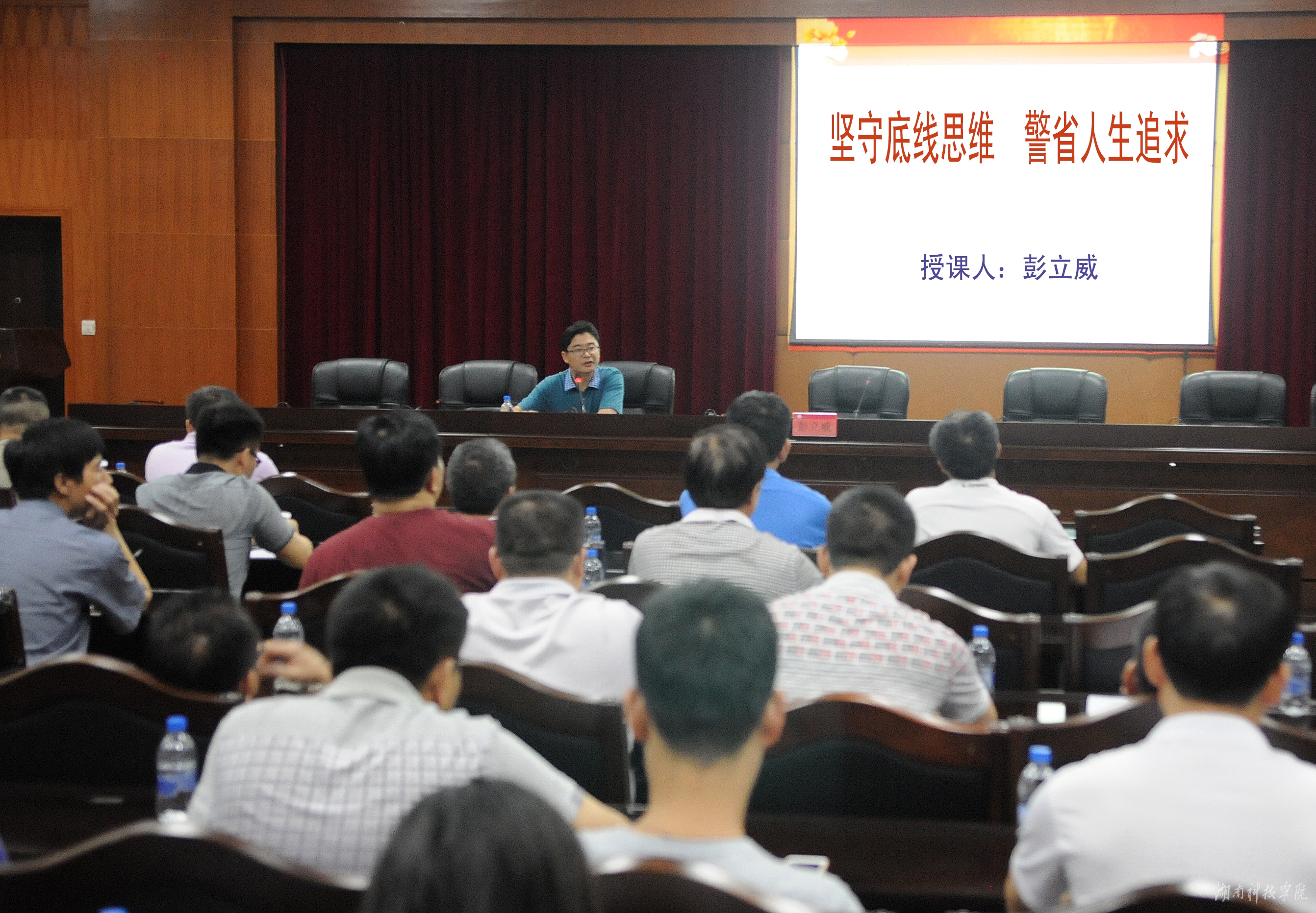 本网讯(记者 吴亚 摄影 秦峰)6月18日晚,vwin德赢基层党组织干部培训班第二讲在行政办公楼八楼会议室举行。校纪委书记彭立威作题为《坚守底线思维,警省人生追求》专题党课。各机关党总支委员以及全体处级干部参加培训。