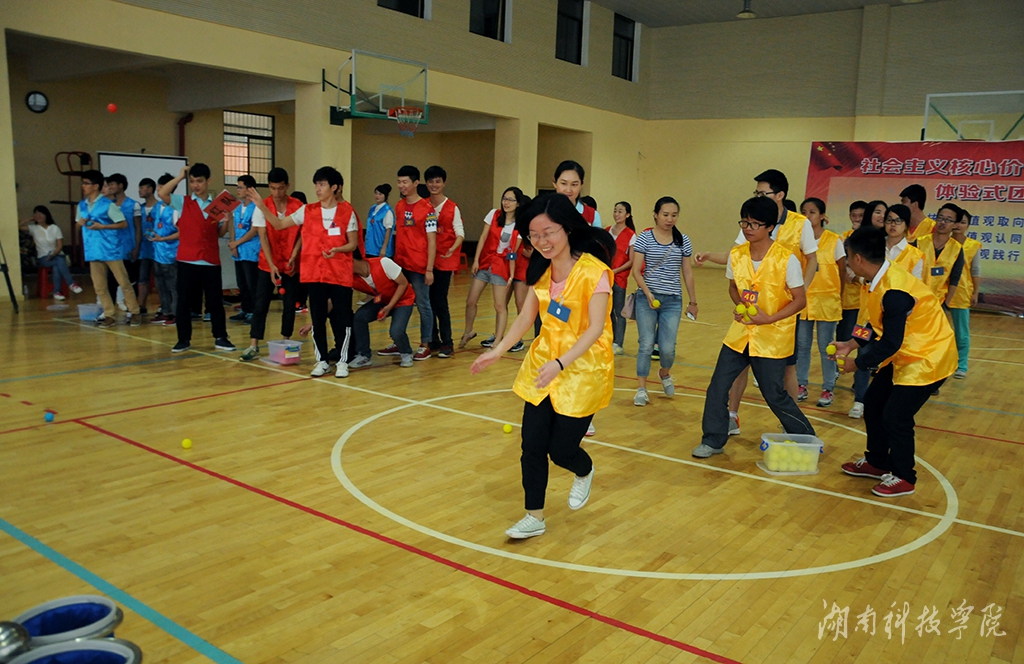 通过手挽手、背靠背的形式,每队听口令,做深蹲的形式,听口令大声说出社会主义核心价值体系关于“国家、社会、个人”等方面的内容。这一热身运动大大加强了学生党员之间的团结和熟悉程度,各队都齐心协力,坚持不懈地做出自己的动作。“核心价值赞赞赞”环节中,学生党员以自己的理解用100个星星对12个关于社会主义核心价值体系的话语点赞,并在其队伍中进行分享; “核心价值观认同”环节中,每个同学用掷球的方式,抽取盒子里面的图片,从12个倡议语中选择与之配套的答案; “核心价值谈谈谈”中,通过12段动画的形式,阐述12个倡议语在日常生活中的深刻含义; “合作拼图”环节中,通过对12个倡议语的理解,团队协作的能力以及对集合图向的熟练程度的考验,将12个倡议语的理解深入到生活的各个方面。