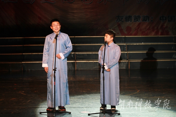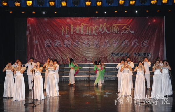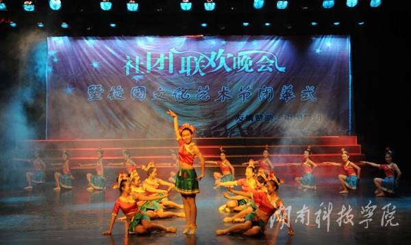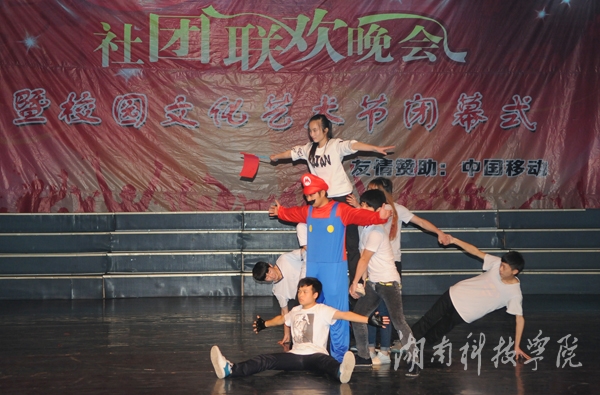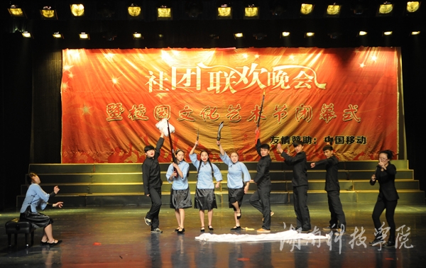晚会在社团宣传片中拉开帷幕。轻快的旋律,动力十足的舞蹈《La song》迅速点燃全场气氛;由播音主持协会带来的《滑板鞋》以网络疯传的《我的滑板鞋》为背景音乐,优美的舞蹈与声情并茂的朗诵完美结合,以及略带诙谐的动作,赢得了观众的呐喊和震耳欲聋的掌声,一度把现场的气氛推向高潮;由绿色潇湘环保协会,秘书协会和vwin德赢志愿者协会合作的《T台秀》,将旧报纸,塑料袋等废弃物品做成的服装,或优雅大方,或粉妆玉琢,各种不同风格的服饰让同学们眼前一亮,真正做到了变废为宝;身着汉服的潇湘七兮汉服社为我们带来了舞台剧《烈烈衣冠·血色汉魂》,慷慨激昂、生动到位的表演,为我们展现了“宁为玉碎,不为瓦全”的古汉人的忠贞;风荷艺术团带来的哑剧《黄河大合唱》,夸张滑稽的动作,生动形象的表演引得现场掌声连连,笑声不断;街舞协会带来的街舞《童年的马里奥》,用马里奥救公主的故事诠释了英勇执着,动感的舞蹈,欢快的旋律给观众强烈的视觉冲击;雅韵陶笛社的乐器演奏《永远思念的故土》则唯美悦耳、宛转悠扬,为大家奉献了精彩的视听盛宴。空手道协会则以剑,棍,等传统武器向同学们展示了中国传统武术的魅力。