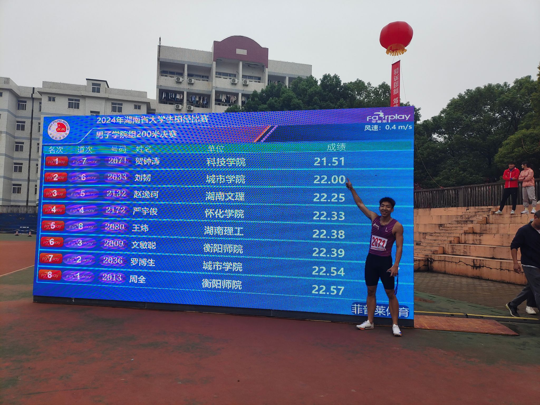 本网讯(通讯员 黄婉 贺钟涛)近日,2024年湖南省大学生田径比赛在湘潭举行。vwin德赢体育学院2022级体育教育专业学生贺钟涛过关斩将,勇夺男子学院组100米、200米双冠,实现了vwin德赢在相关体育赛事领域的历史性突破!