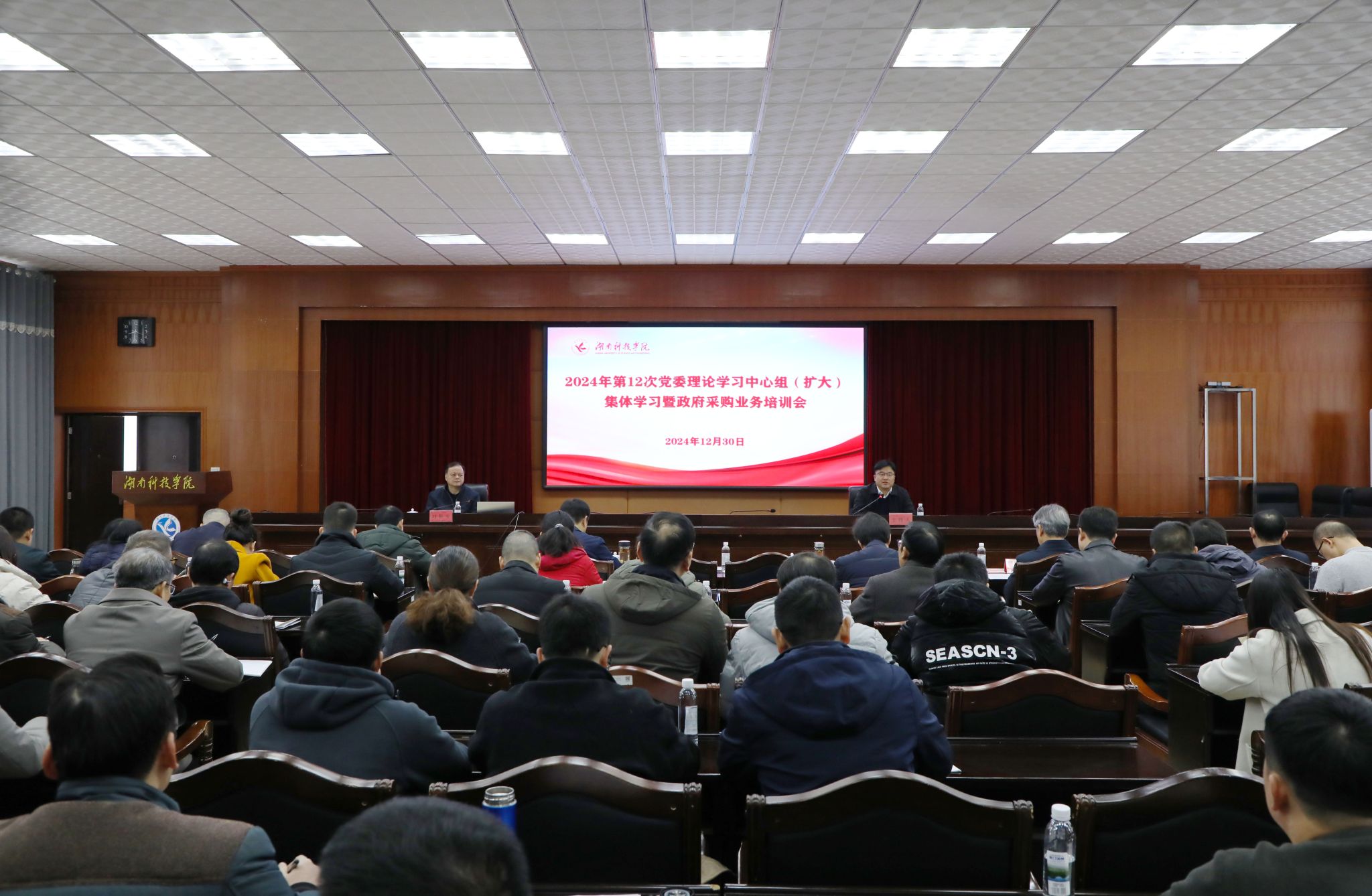 本网讯(记者 马天天)12月30日上午,学校举行2024年第12次党委理论学习中心组(扩大)集体学习暨政府采购业务培训。全体校领导、党委委员,全体中层正职(含主持工作的副职)、校属各单位分管采购工作的副职、教学学院副院长和业务经办人员参加。会议由校党委书记李钢主持。