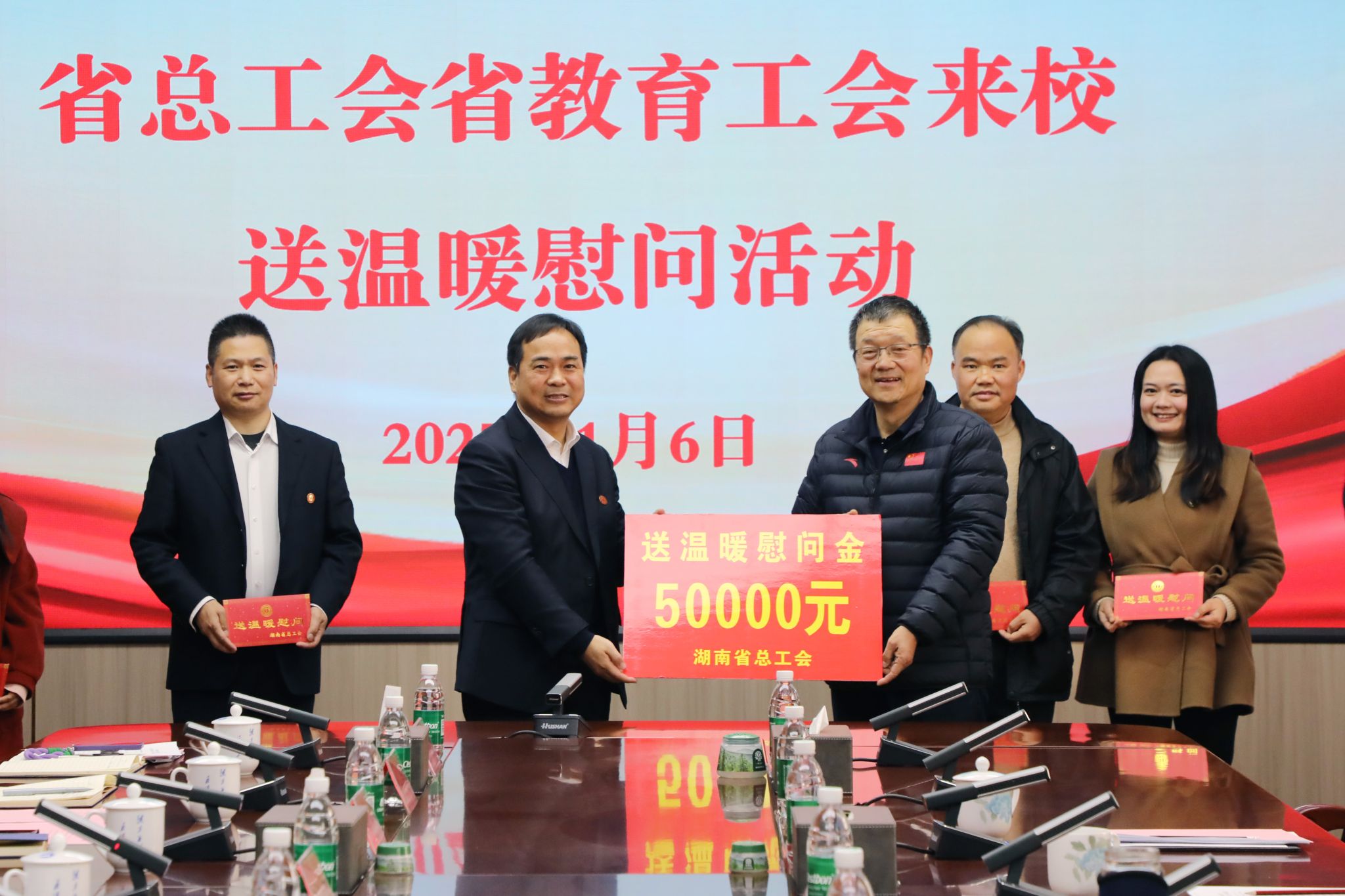 本网讯(记者 孙淑娴 摄影 谢志豪)1月6日,省总工会党组成员、省教育工会主席刘湘凌一行来vwin德赢开展“两节”送温暖慰问活动,省教育工会副主席邓曼,市总工会党组书记、副主席乐家茂等人陪同参加。校党委书记李钢、校长黄创霞、副校长李常健、原副校长吴小林等参加座谈会。