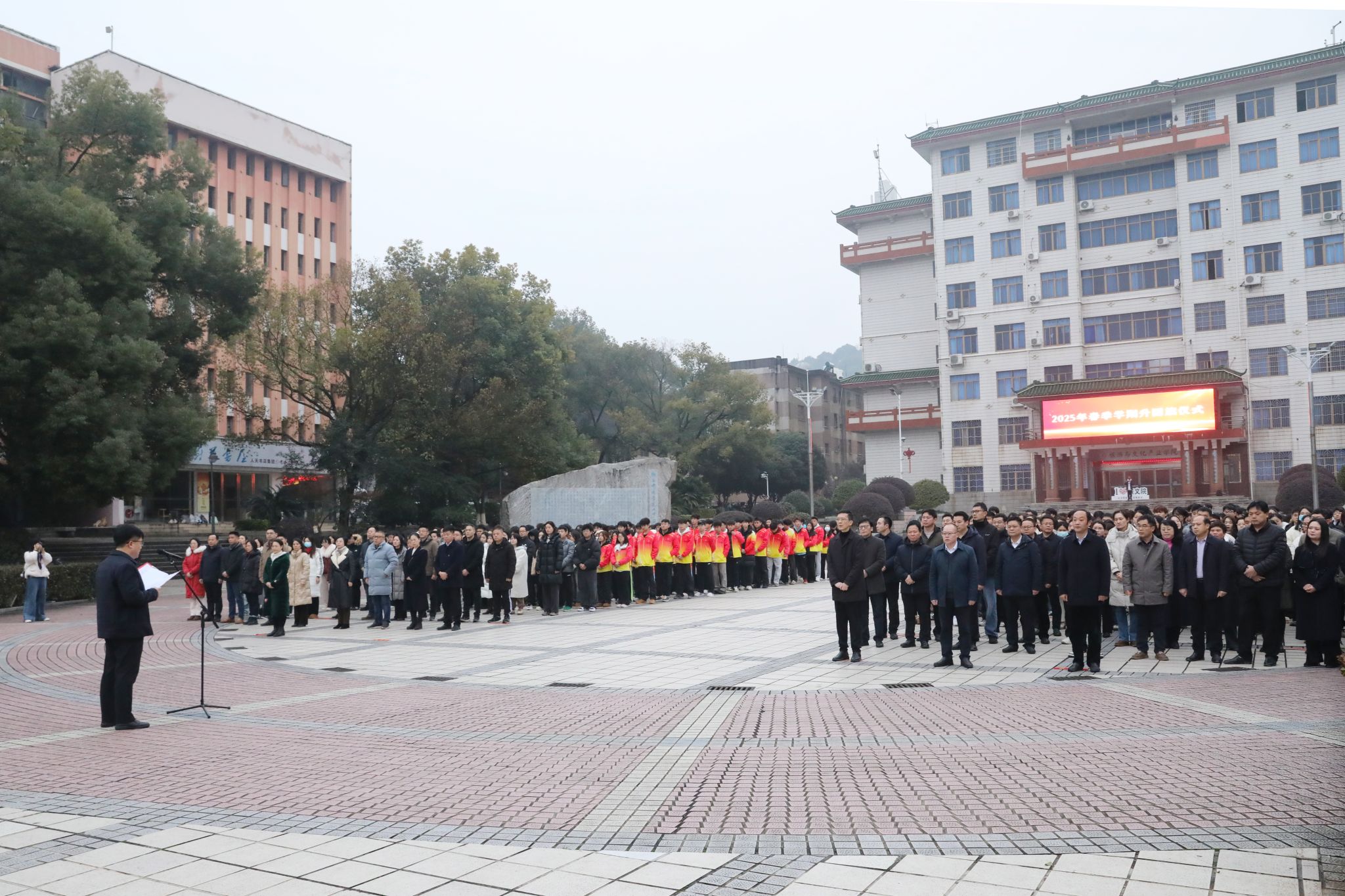 本网讯(记者 向薛峰 摄影 谢志豪)巳蛇献瑞,共启新程。2月24日,全体在校校领导、党委委员及1000余名师生齐聚舜德广场,举行2025年春季学期“开学第一课”暨升国旗仪式。校党委书记李钢作国旗下的讲话,党委委员、副校长何福林主持仪式。