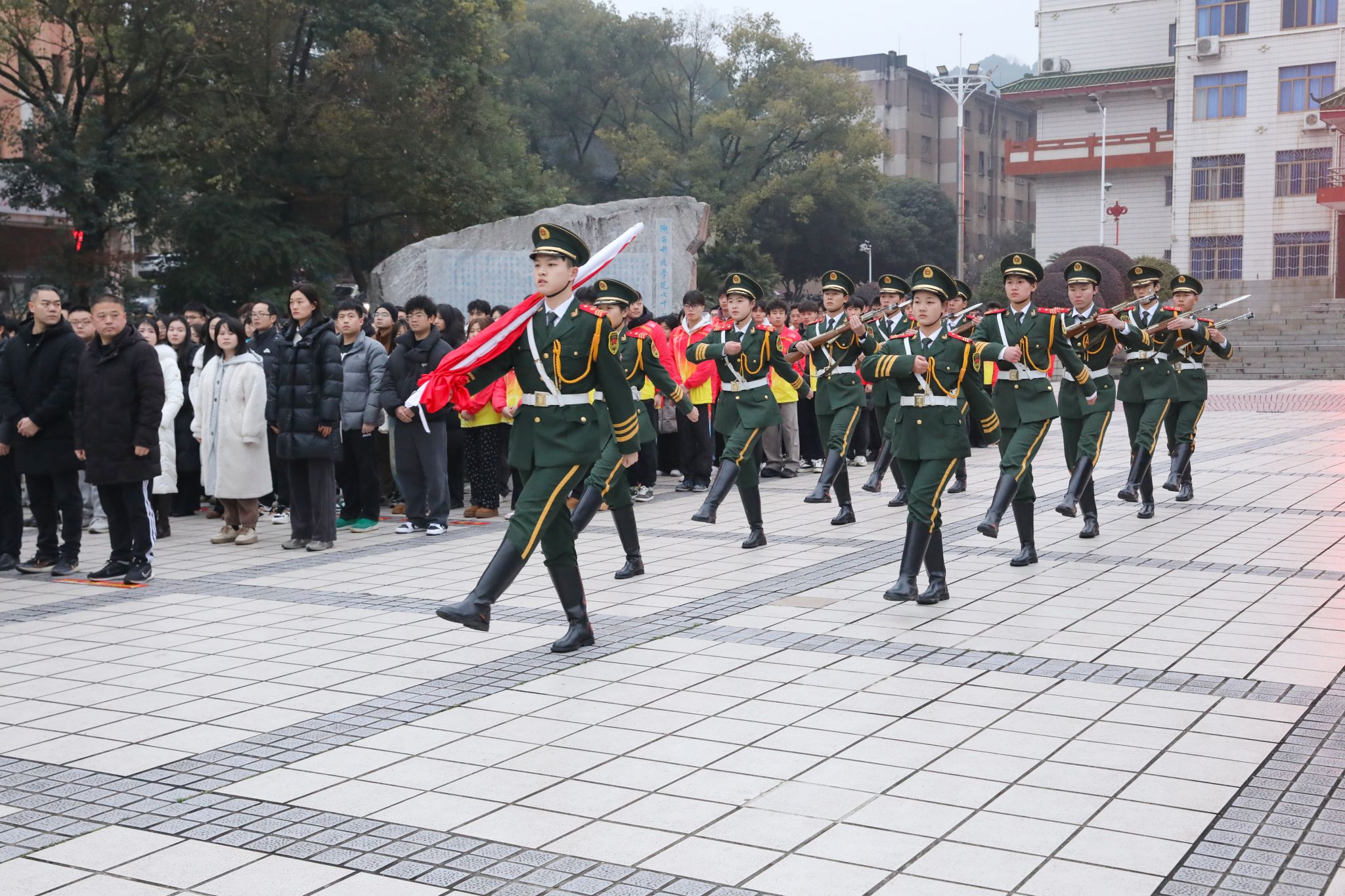 国旗护卫队迈着铿锵有力的步伐,护送国旗入场。伴随着庄严的国歌,全体师生向国旗行注目礼,鲜艳的五星红旗在晨曦中迎风飘扬。