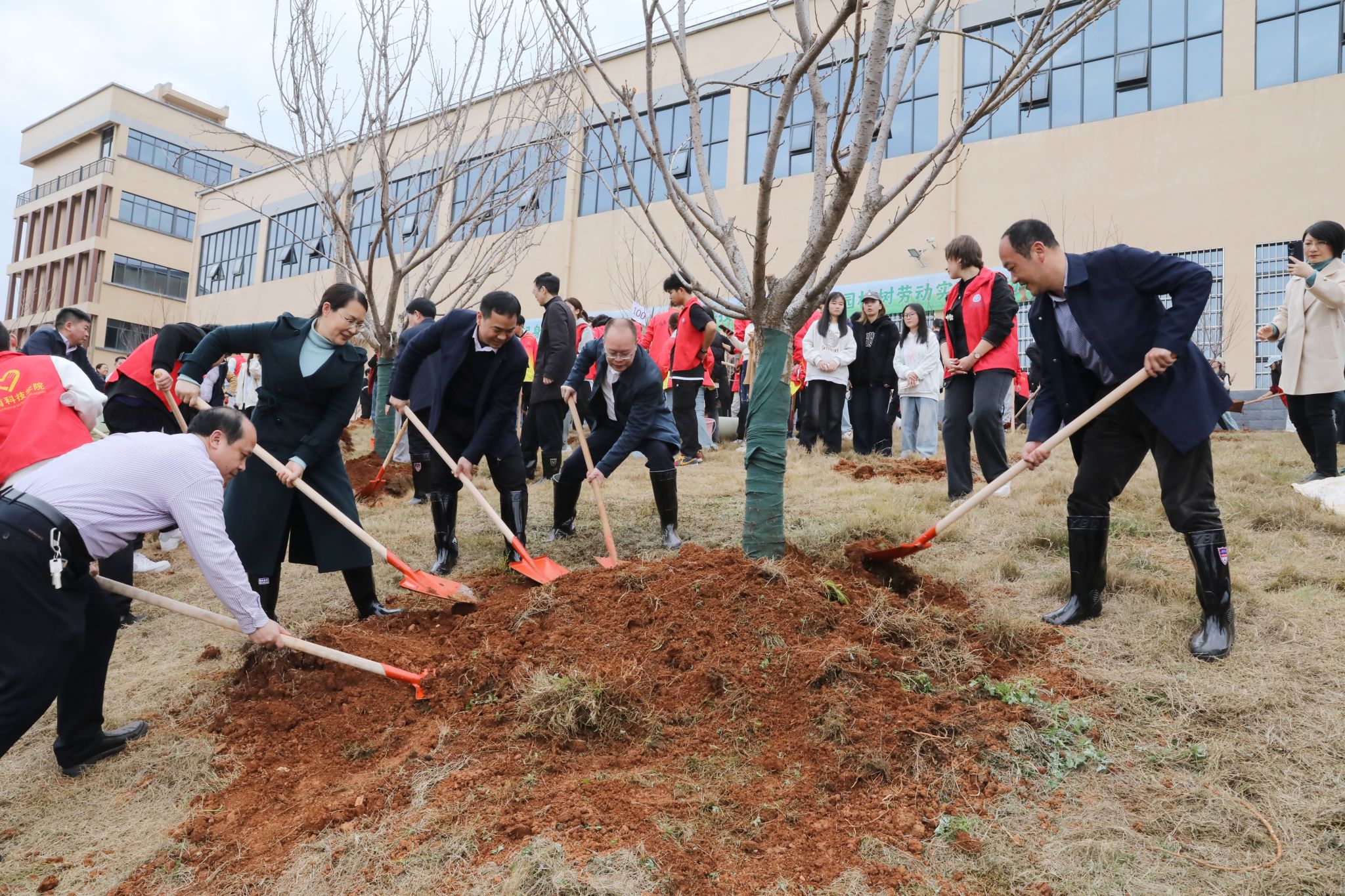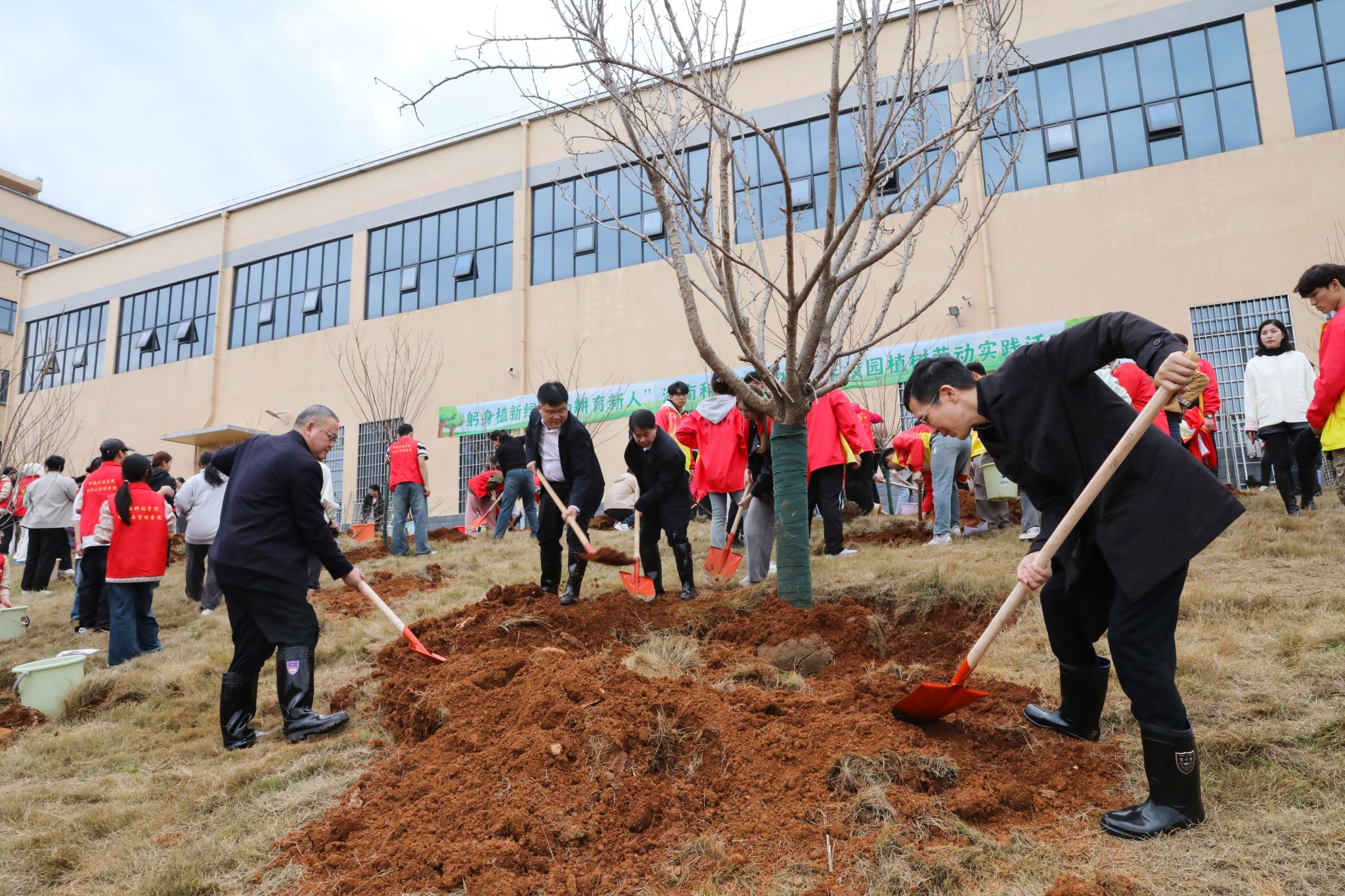 活动现场,师生们三五成组默契配合,挥锹铲土、栽植新绿、踩实修整、提桶浇水,现场一派热火朝天的劳动场面。在大家的通力合作下,近200株樱花树苗扎根校园。