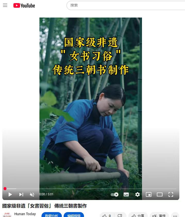 女书习俗作为国家级非物质文化遗产,是发源于湖南江永地区的女性专属文字系统,被誉为“世界唯一女性文字”,其独特的文化价值和艺术表现形式备受国际关注。此次发布的短视频以生动的镜头语言和精准的英文解说,详细呈现了女书“三朝书”的制作工艺与文化内涵,彰显了女书习俗的独特魅力,为海外观众打开了一扇了解湖湘文化的窗口。