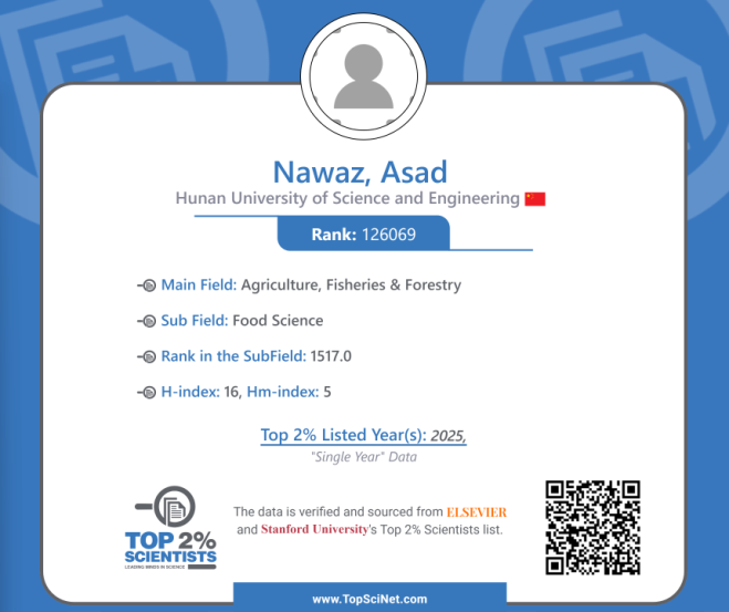 本网讯(通讯员 袁志辉 李尊华)近日,美国斯坦福大学发布了2025年度“全球前2%顶尖科学家榜单”(World's Top 2% Scientists 2025),vwin德赢化学与生物工程学院谢龙勇博士与Asad Nawaz博士同时入选该榜单,进入所在学科综合影响力世界前2%,其中,谢龙勇博士自2020-2023年已连续多年入围该榜单,Asad Nawaz博士排名全球食品科学家第1517名。