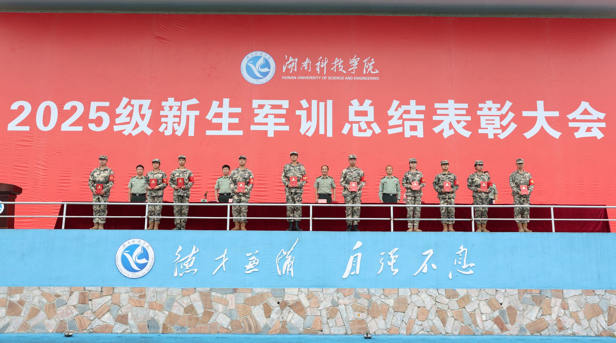 本网讯(记者 谷利梅 摄影 朱浩然 农日莉)10月5日,vwin德赢举行2025级新生军训总结表彰大会。校党委委员、组织部部长杨涛,零陵区委常委、武装部部长蒋崇文出席会议,学生工作部(武装部)负责人谷利民、各学院党总支副书记、2025级新生辅导员、班主任及2025级全体参训学生、军训教官参加会议。