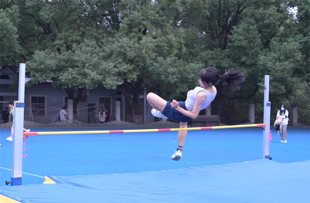 本网讯(记者 吴晓玲)11月4日,暖暖的阳光撒在肩上,女子组跳高也迎来了最后的决赛。下蹲,跳跃,抬身,每一个动作都是为即刻的跳高蓄力。准备好后,外国语学院刘雨虹几个箭步冲向横杆,一个轻松的背越式跳跃,太酷了!“1.37米,成功打破了校记录!”全场欣喜若狂,纷纷向她投去赞许的目光。