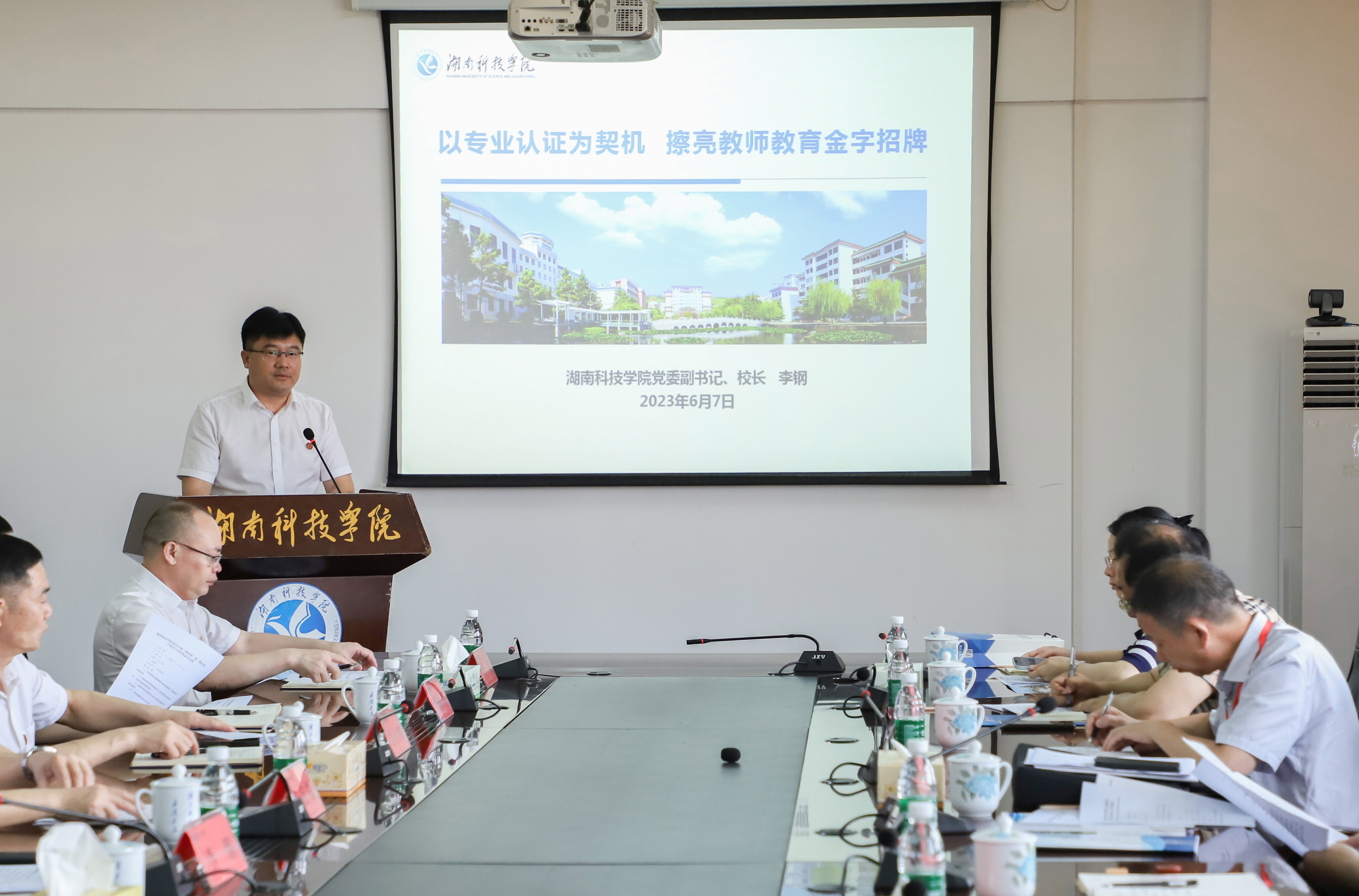 本网讯 6月7日,学校召开英语专业(师范类)第二级认证专家组见面会,专家组组长、江苏师范大学副校长钱进,嘉兴学院外语学院院长唐艳芳,信阳师范大学教务处原副处长范小伟,江西师范大学教育学院张丽,重庆市丰都县教师发展中心主任周勇,内江师范学院副研究员王辉,重庆市教育评估院师范类专业认证省域负责人谭辉晔,全体校领导、党委委员出席考察见面会。会议由钱进主持。