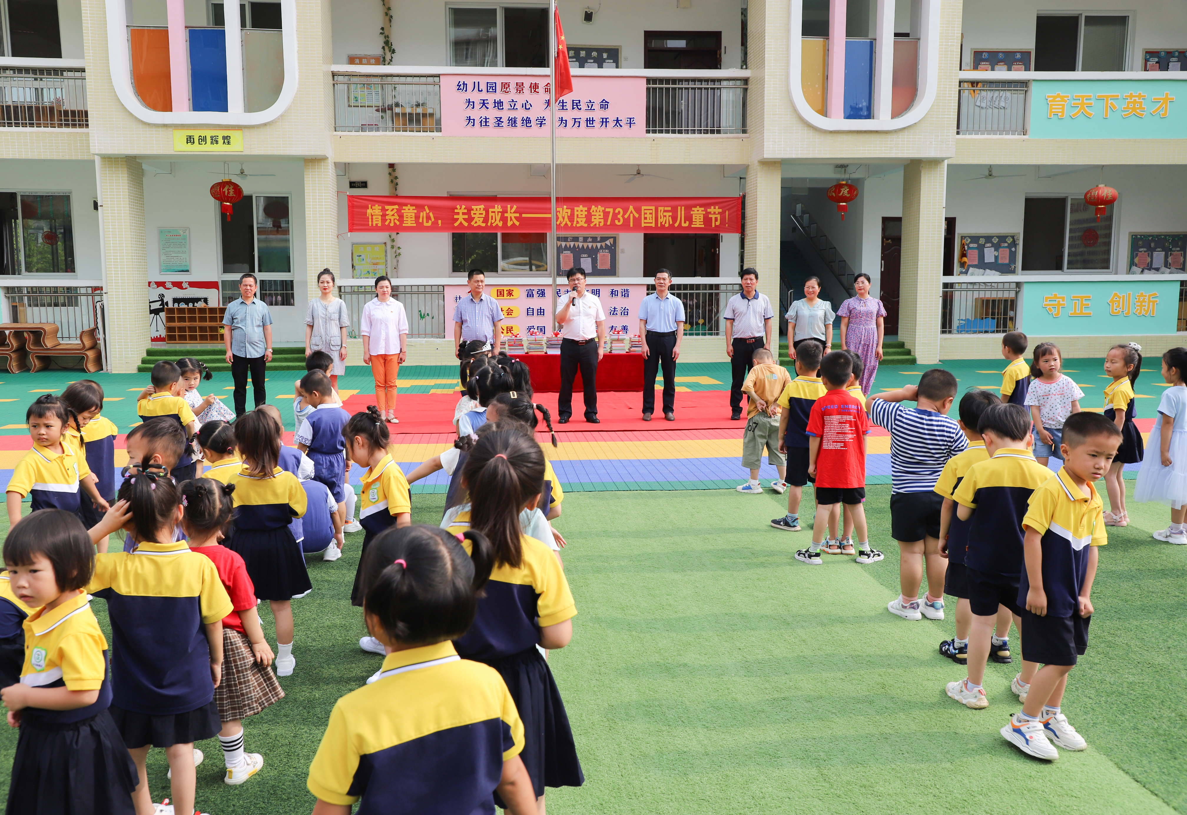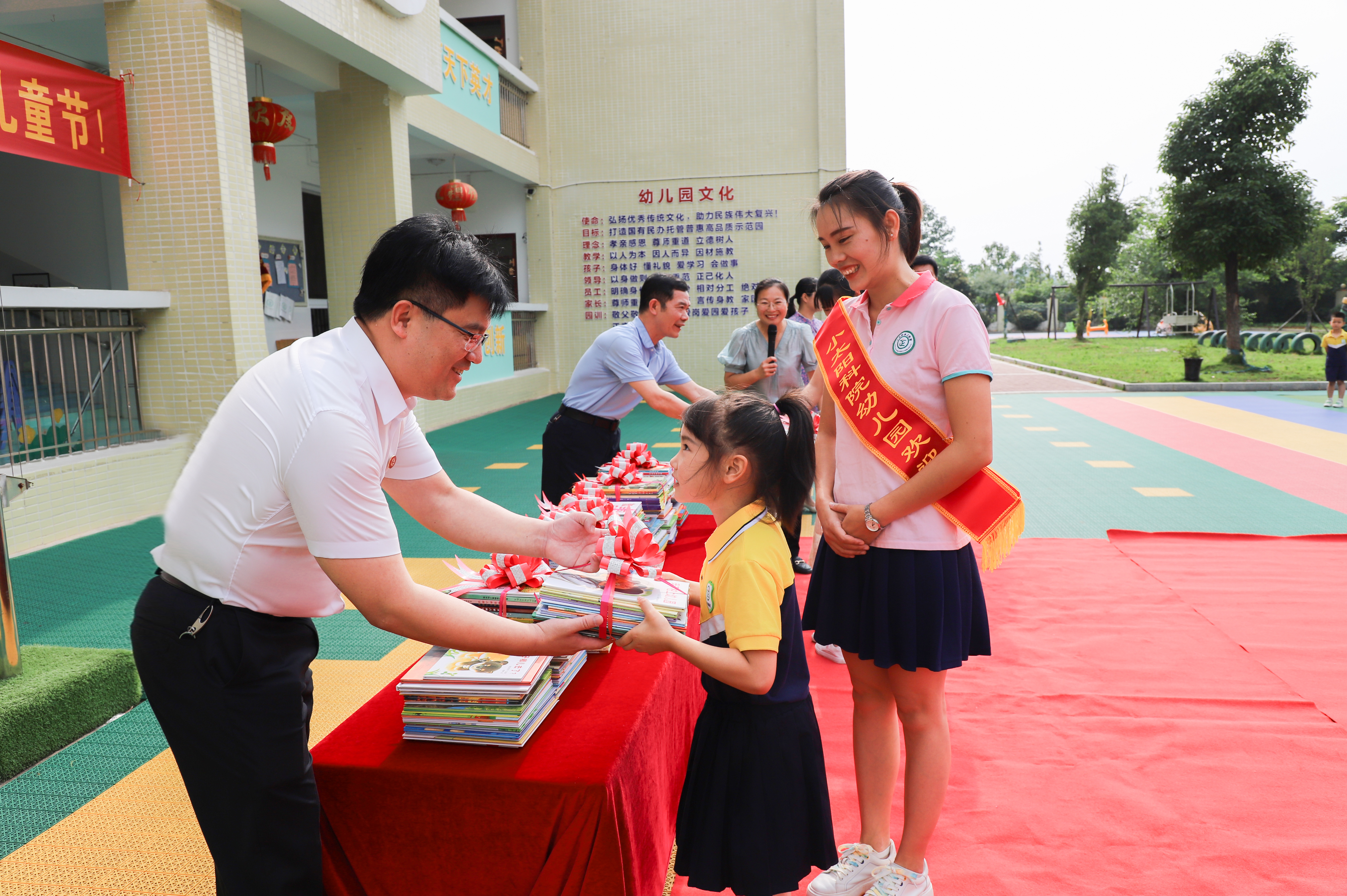 在幼儿园操场,小朋友们正在欢唱儿歌,欢声笑语不断。李钢、吴小林走到小朋友们中间,和他们交流互动,给每一个小朋友送上精美的绘本。