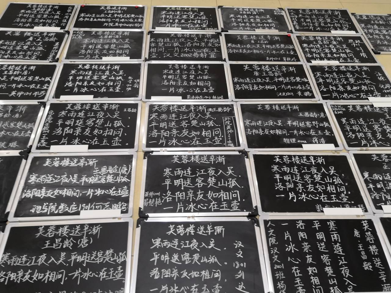 大赛分为钢笔、毛笔、粉笔书写三项。活动现场,参赛者们聚精会神,笔走龙蛇,经过四个多小时的奋笔疾书,展现出一幅幅优美的书法作品,共提交钢笔字作品350份、毛笔字80份、粉笔字247份。