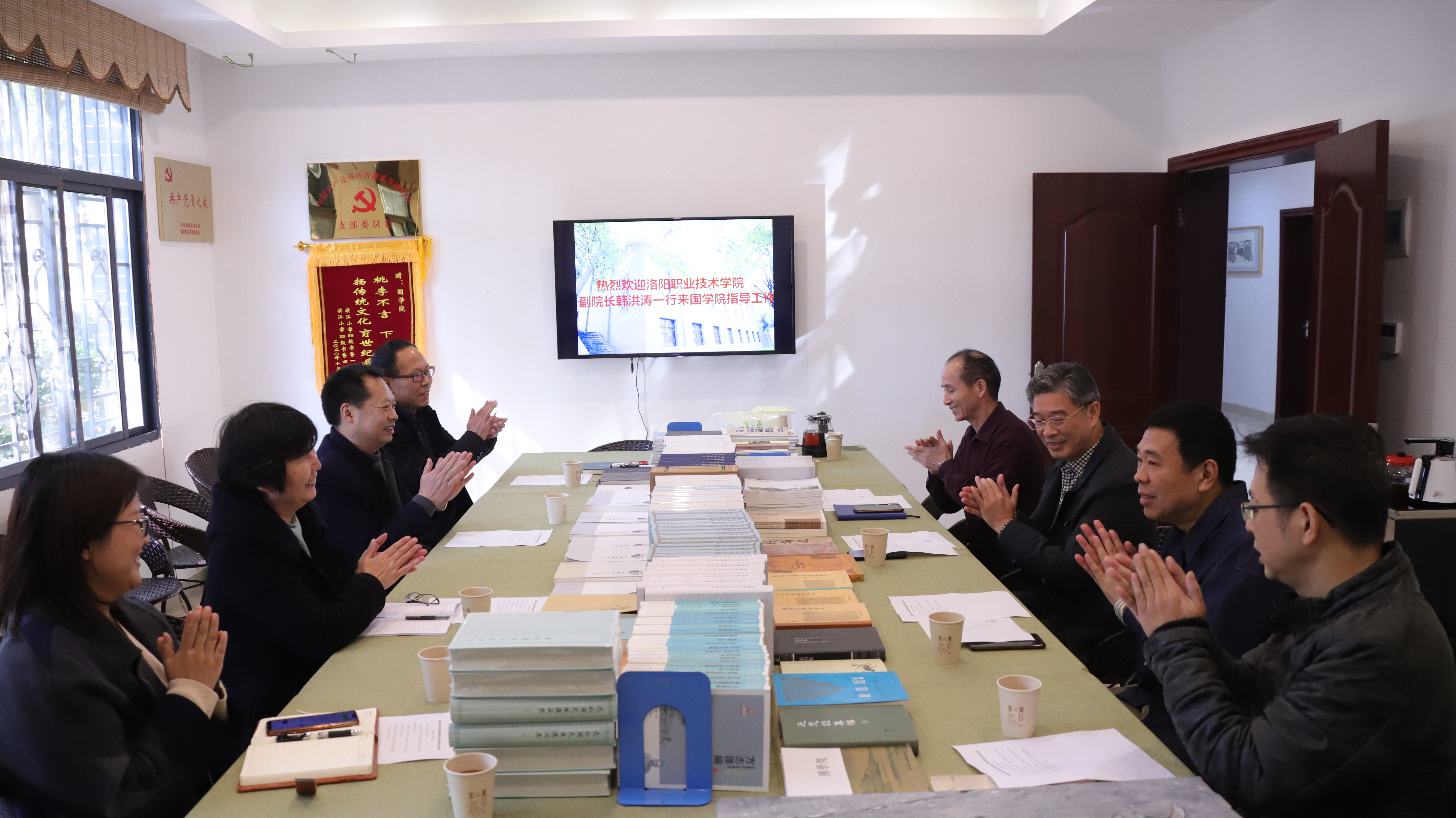 韩洪涛对学校的热情接待表示感谢,并简要介绍了洛阳职业技术学院的情况以及他们筹建国学院后的工作设想,希望双方今后能就国学院建设、课程设置、教师交流等工作加强交流,实现互补双赢。
