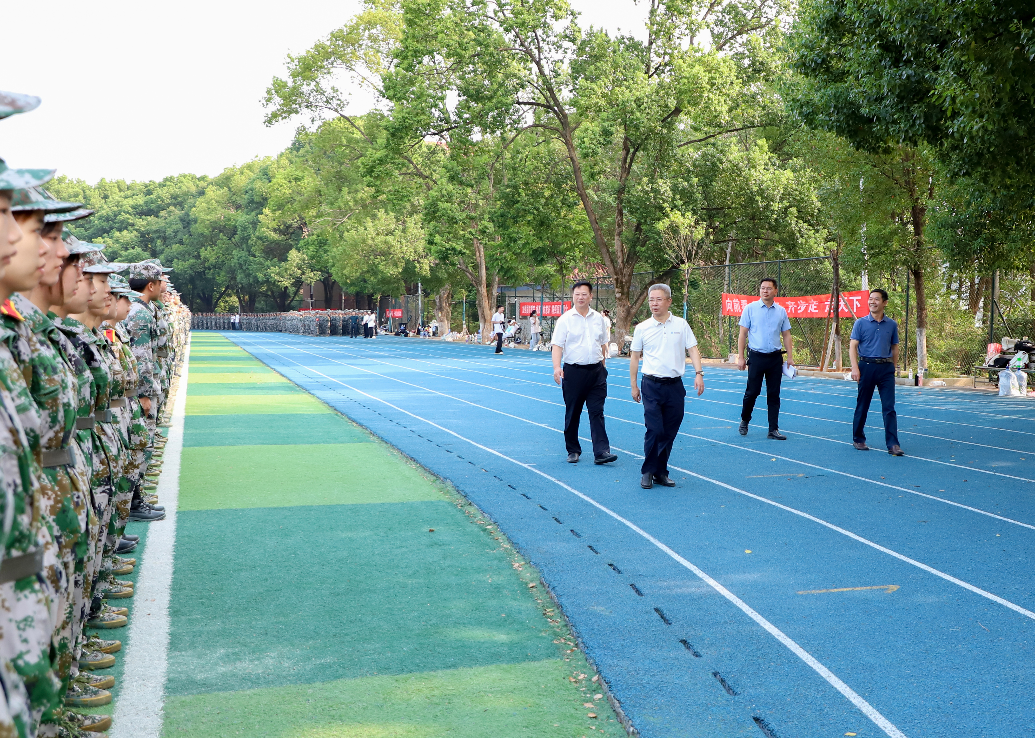 李钢走进军训队伍中,鼓励同学们要勇于战胜自我、超越自我,克服困难、磨练意志,培养团队意识,增强国防观念、厚植爱国情怀,为大学第一课交上满意的答卷。