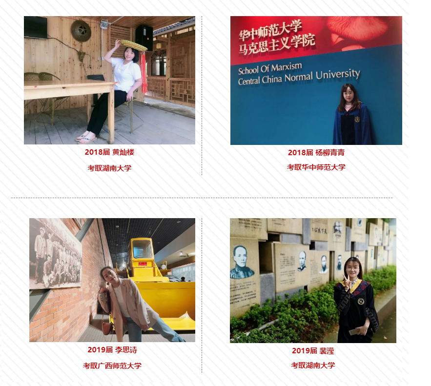 自2006年开办思想政治教育本科专业以来,一批应届毕业生先后考取了湖南大学、华中师范大学、广西师范大学、华东师范大学、上海大学、西南大学、湘潭大学等省内外知名高校硕士研究生,考研录取率居全校前列。