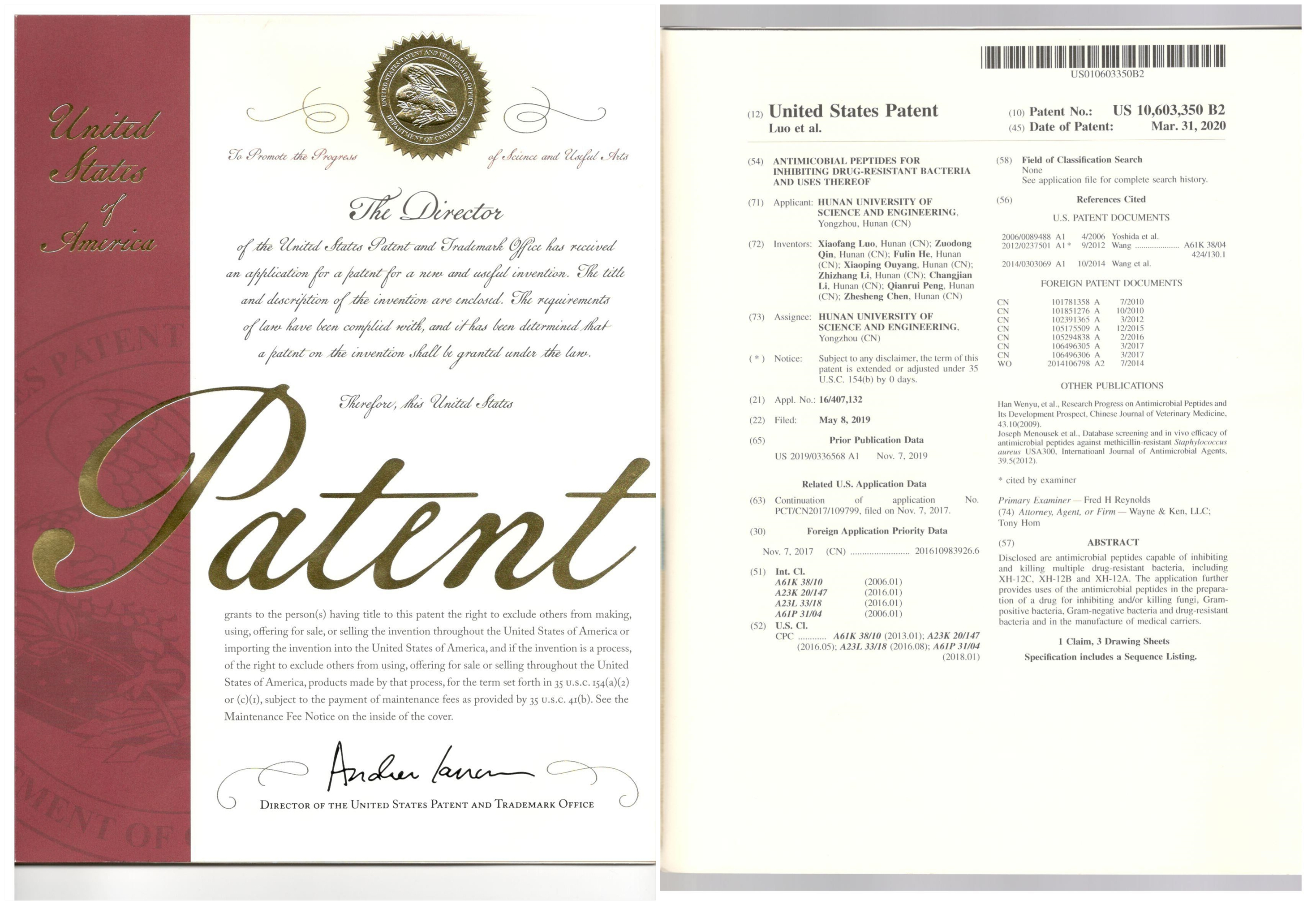 本网讯 近日,由vwin德赢覃佐东博士团队领衔的生化工程技术研究中心完成的技术发明成果获得国际授权,《ANTIMICOBIAL PEPTIDES FOR INHIBITING DRUG-RESISTANT BACTERIA AND USES THEREOF》(《抑制耐药细菌的抗菌肽及其用途》)(授权编号:US 10,603,350 B2 ),这是vwin德赢生物化工团队完成的技术发明专利成果首次获得国际授权。