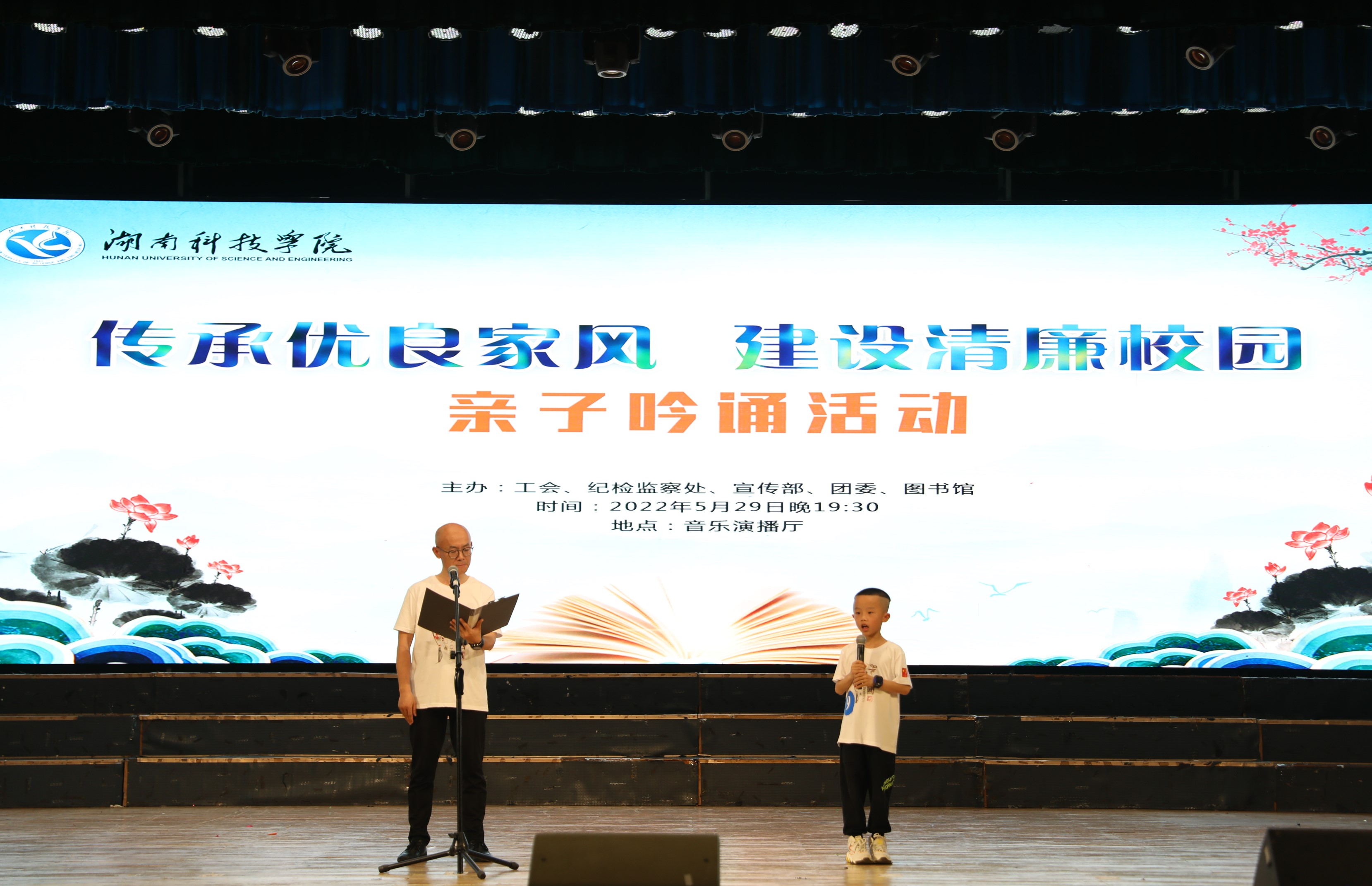 本网讯(记者 黄宇莹 刘琴)5月29日晚,由工会、纪检监察处、宣传部、团委、图书馆共同主办的“传承优良家风 建设清廉校园”亲子吟诵活动圆满落幕。党委委员、副校长、工会主席吴小林,党委委员、纪委书记陈灿军,工会常务副主席石循忠出席活动,来自各学院、各机关处室的老师们共同观看表演。