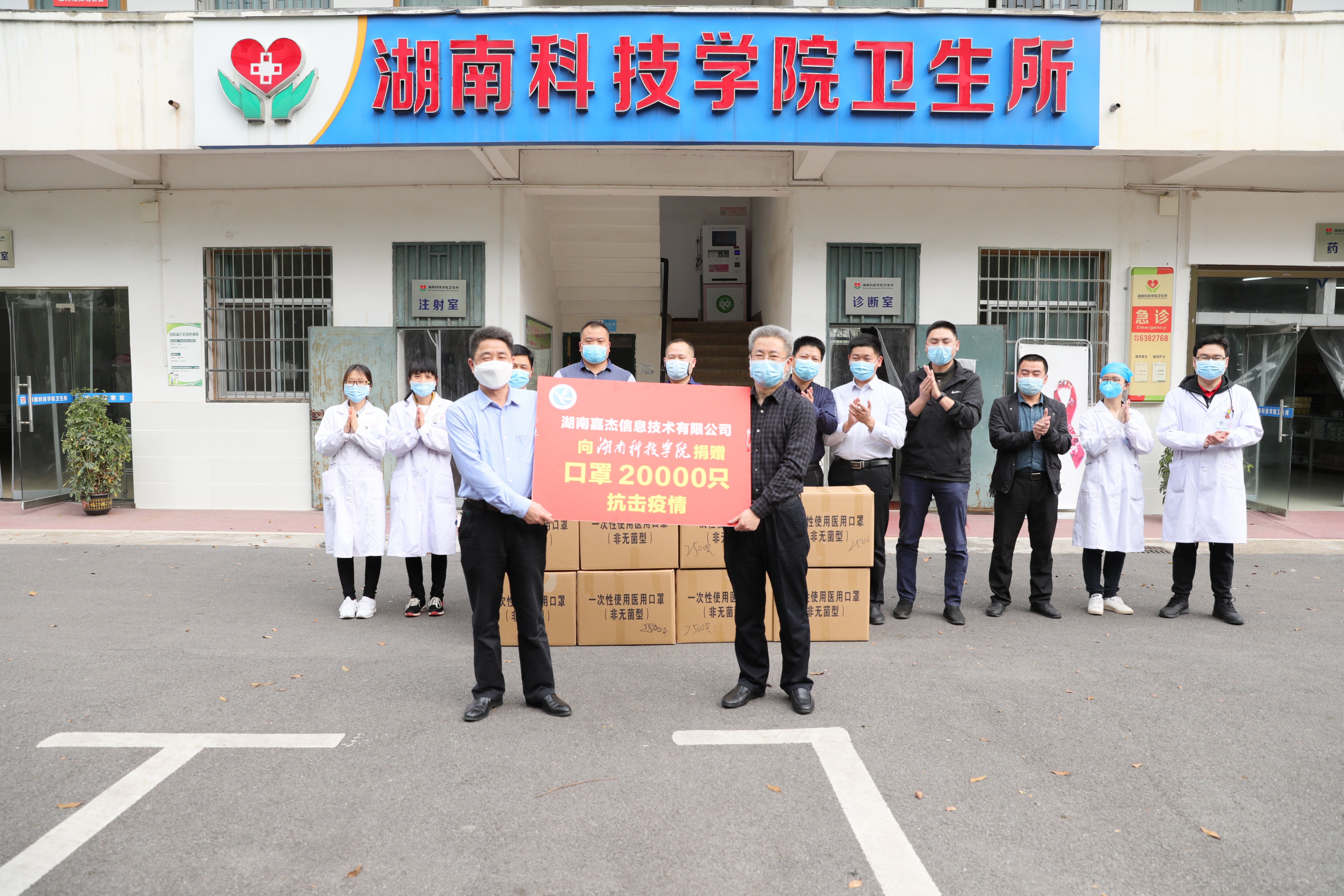 本网讯 3月24日下午,湖南嘉杰信息技术有限公司向学校捐赠两万只口罩,助力校园防控。校党委书记曾宝成、副校长程智开参加捐赠仪式。