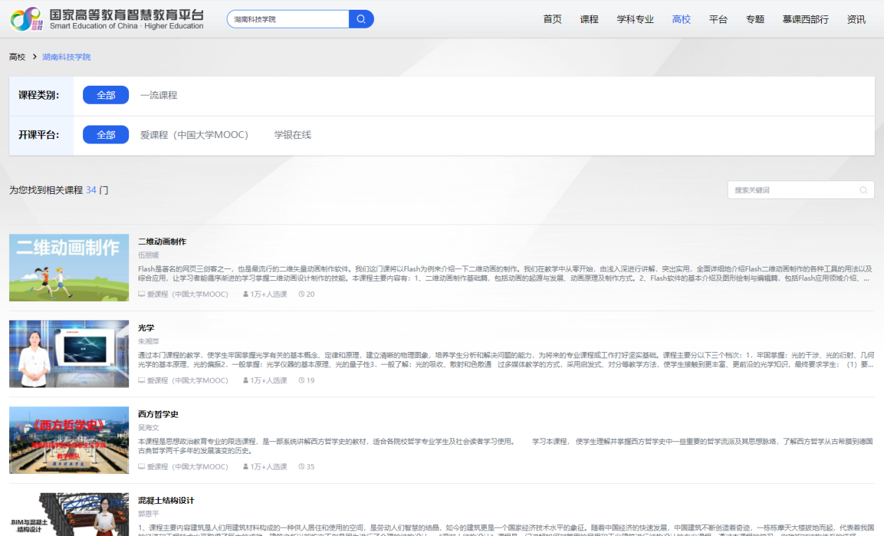 本网讯(通讯员 代军垒 郭宜娟)近日,国家高等教育智慧教育平台正式上线,在首批上线的课程中,vwin德赢有34门优质课程入选,覆盖了vwin德赢8个学科34个专业类。在湖南省入选的32所地方高校中,vwin德赢入选课程门数数量排名第九,除大学外,学院高校入选门数数量排名第一。