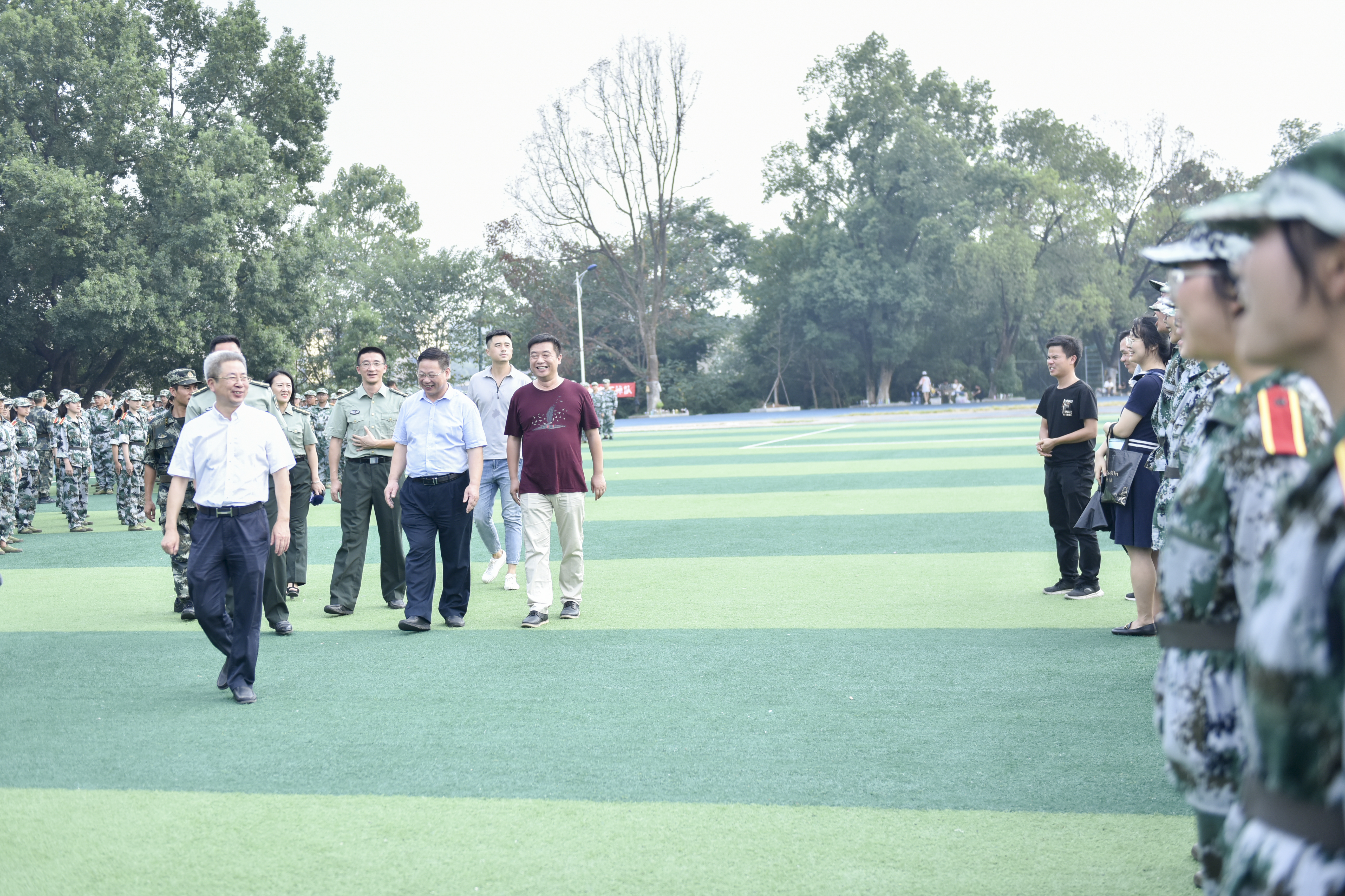 曾宝成、李钢来到各军训场地,看望慰问了正在施训的军训教官和各学院师生,查看了军训医疗保障、后勤保障等服务情况,详细了解2019级新生军训的进展情况。 在训练场上,军训教官认真施训、口令洪亮,参训新生军姿挺拔、步伐整齐、口号嘹亮,呈现出一派生龙活虎、昂扬向上的精神风貌。