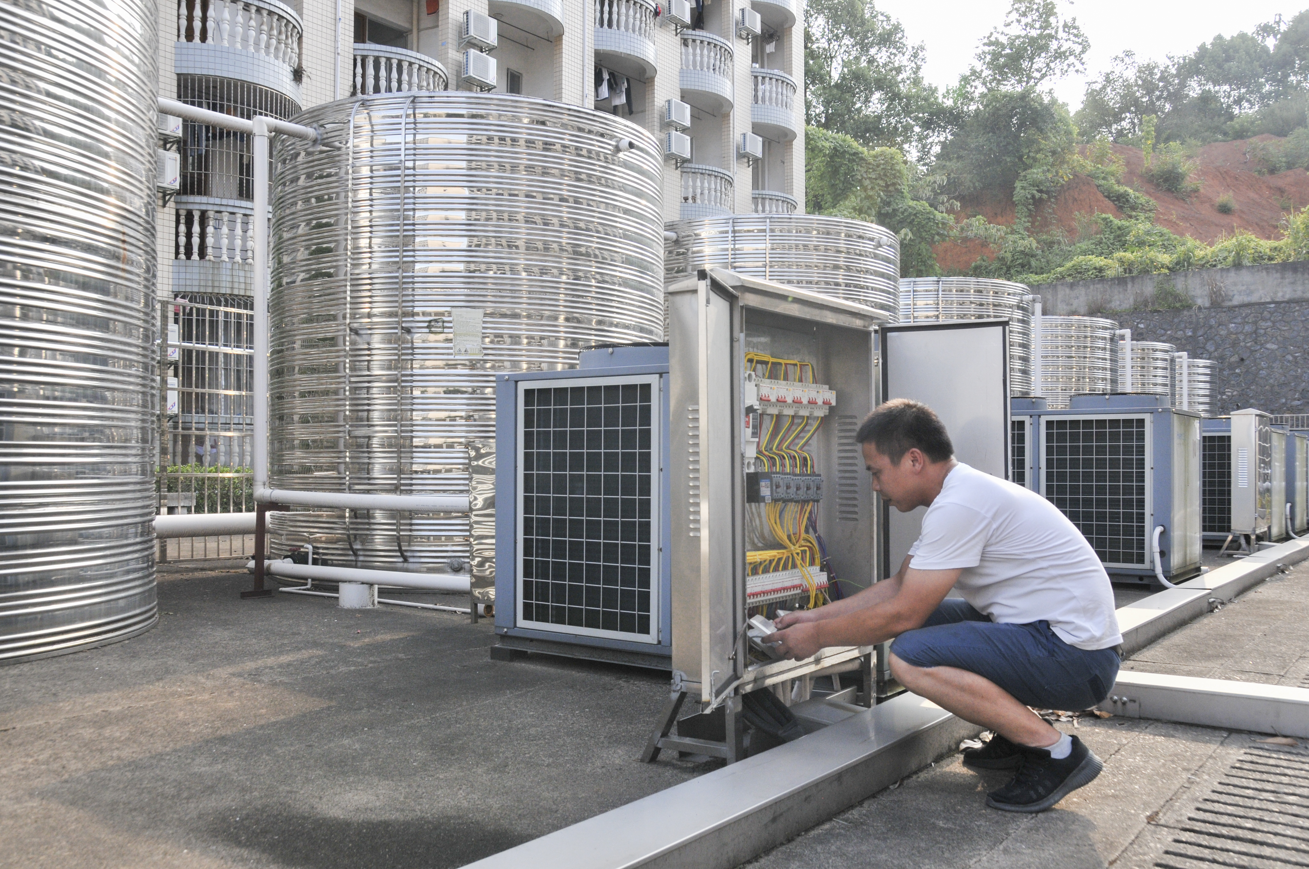 后勤人员仔细检查热水供应系统