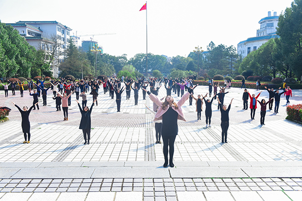 据悉,此次教职工工间操健身活动由学校工会牵头组织,旨在激励广大职工积极参加体育锻练,提高职工的身体素质。这项教职工全民健身活动将于3月11日开始,按照“统一时间、相对集中、因地制宜、人人参加”的原则,根据实际情况,在每周工作日的第二、三节课课间开展。从第一天的现场情况看,活动获得了全校教职员工的积极响应,大家参与的热情高涨,现场气氛十分活跃。教职工们纷纷表示,平时因为工作繁忙的原因缺少锻炼,每天抽出20分钟做工间操,既能轻松筋骨、远离疾病、健康身心,还能提高工作效率,传达快乐工作、健康生活的理念。