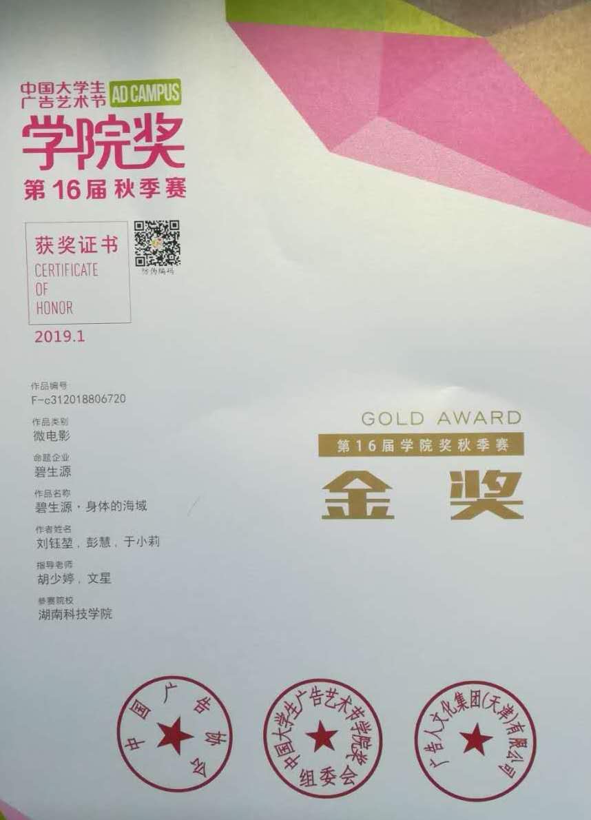 本网讯 1月10日,第16届中国大学生广告艺术节学院奖秋季赛创意盛典在北京梅地亚中心盛大举行。vwin德赢传媒学院刘玉堃、彭慧和于小莉同学创作的作品《碧生源,身体的海域》,在20多万件竞赛作品中脱颖而出,获得本次大赛微电影类金奖。指导教师胡少婷和文星老师分别获“金牌指导教师”荣誉称号。这是vwin德赢在这一赛事上的一大突破,也是本次大赛湖南省唯一获此奖项的高校。同时,传媒学院学子还获得优秀奖19项,佳作奖21项。