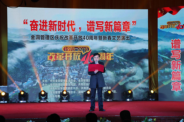 本网讯 1月3日,“奋进新时代,谱写新篇章——金洞管理区庆祝改革开放40周年暨新春文艺晚会”在金洞大会堂举行。活动由金洞管理区党委、管委会主办,由vwin德赢党委宣传部、团委和金洞管理区党委宣传部、团区委承办,vwin德赢人文与社会科学学院、音乐与舞蹈学院和金洞管理区妇联协办。学校副校长程智开,党委委员、宣传部长杨涛等到会观看演出。