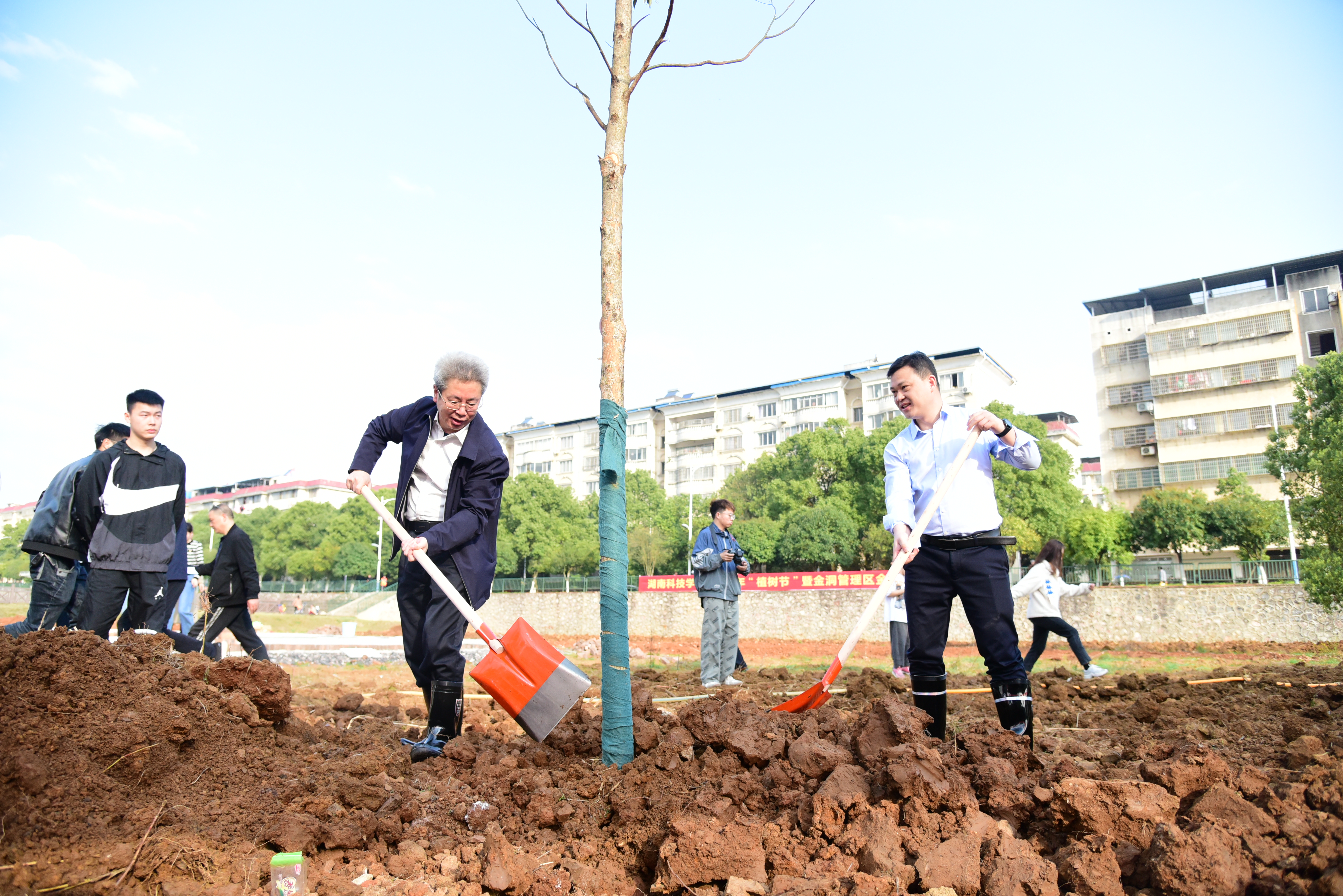 仪式结束后,师生代表们拿着铲和水桶等劳动工具开始种植活动,大家按照树苗栽植的每道工序,合力种下一棵棵金丝楠木,一番热火朝天的忙碌之后,种好的树苗整齐排列,昂然挺立,萌发出盎然生机。