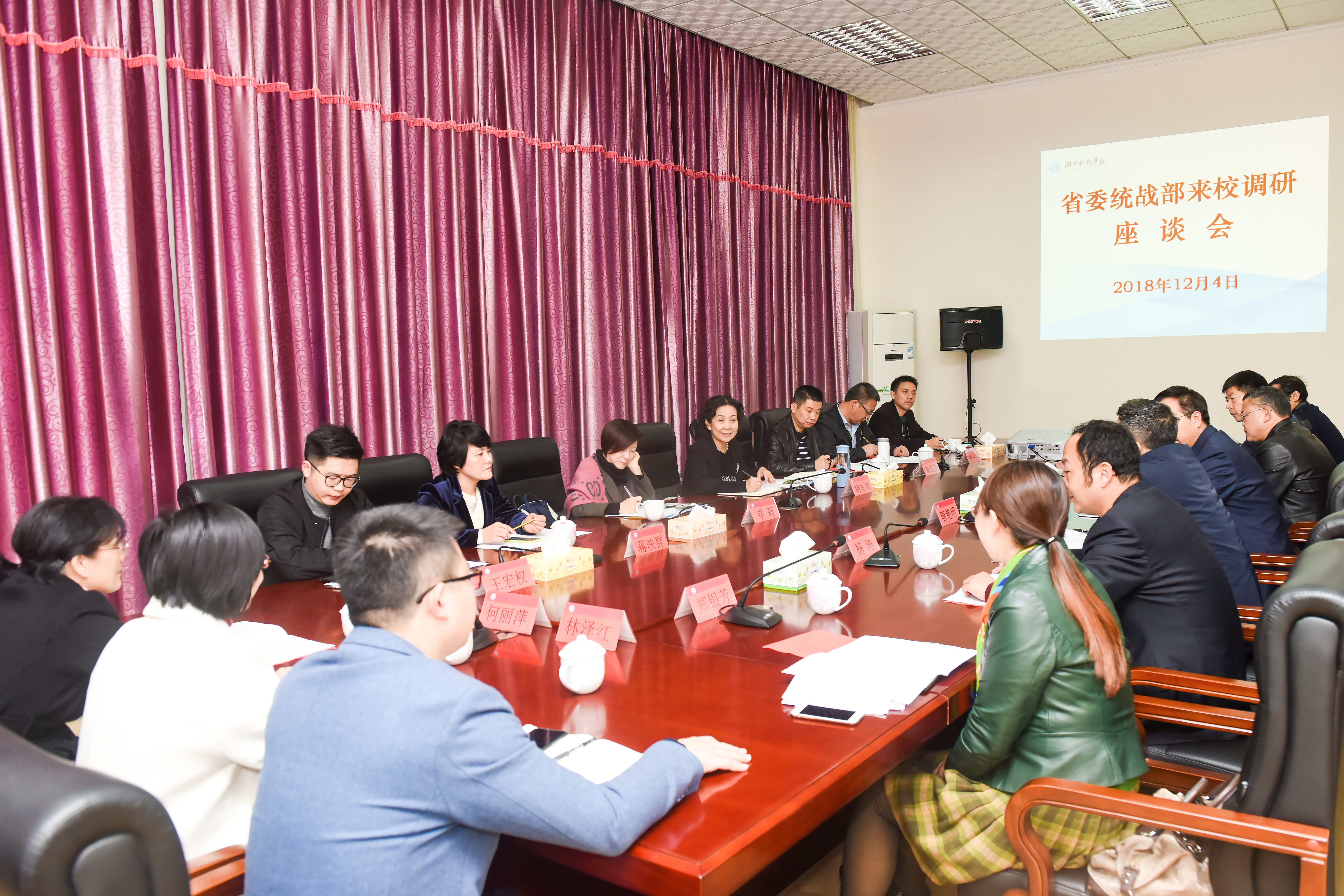 本网讯 12月4日,中共湖南省委统战部副部长胡东风来校调研统战工作,市委统战部常务副部长、市工商联党组书记贺一夫,零陵区委常委、统战部长蒋映群陪同调研。校党委书记陈弘,党委副书记唐艳明,党委委员、组织部长何福林,党委委员、宣传统战部长杨涛,学校党外代表人士参加调研座谈会。