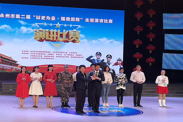 本网讯 10月23日,永州市第二届“以史为鉴,强我国防”主题演讲比赛在永州市广播电视台演播厅举行。市委副书记、政法委书记、市国教委主任何录春,市委常委、宣传部长、市国教委副主任贺辉,市军分区司令员熊壮大校等参加活动,并为获奖选手颁奖。