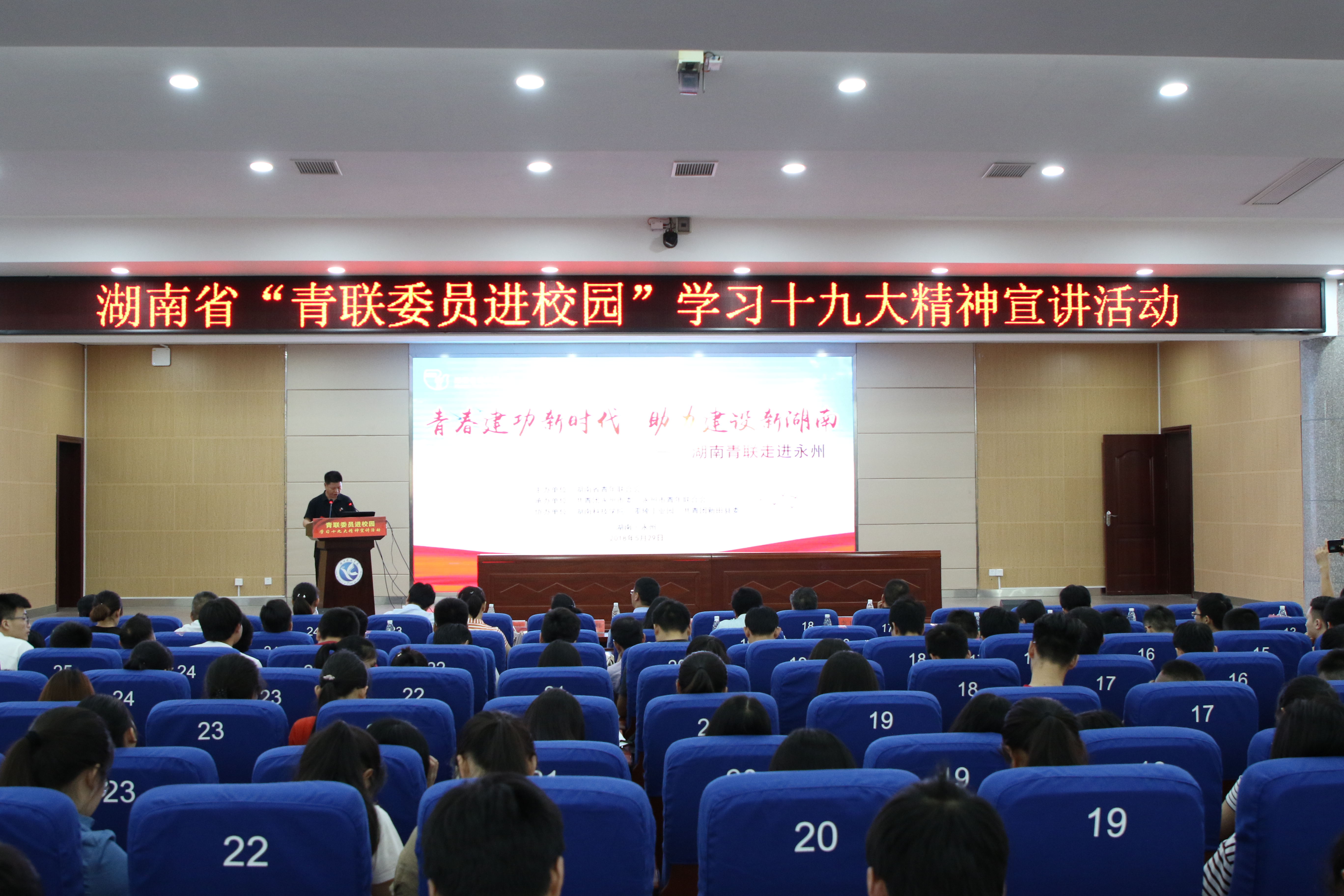 本网讯 5月29日上午,湖南省“青联委员进校园”学习十九大精神宣讲活动在vwin德赢潇湘大讲堂举行。共青团湖南省委统战部部长、省青联秘书长李卫锋参加活动,副校长程智开出席,团市委副书记、市青联主席李玲主持宣讲会。