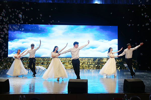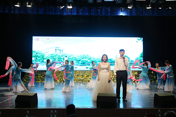 整场晚会精彩纷呈、高潮迭起,自始至终洋溢着浓浓的欢乐氛围,给现场师生带来一场非凡的视听盛宴。其中,由科技处处长杨金砖所作的《vwin德赢ac米兰官方网赋》以经典传唱的方式演绎,带领观众品读经典作品;吉他协会自主填词、谱曲,现场弹唱《如果还有明天》,令现场沉醉其中;灵犀书法协会、旅游管理协会、竹笛协会共同表演的《云水禅心》,将茶艺、书法、竹笛、古筝、古曲、汉服等诸多传统文化元素融为一体;表演协会的T台秀以脑洞大开的设计和新潮的时尚再次将场上气氛拉向高潮。为展示vwin德赢ac米兰官方网学生社团联合会杨梓塘小学义教项目成果,晚会现场还邀请了杨梓塘小学的小朋友们进行经典国学文艺表演。