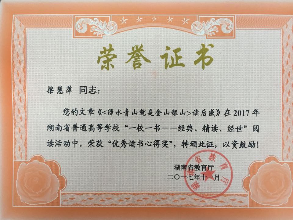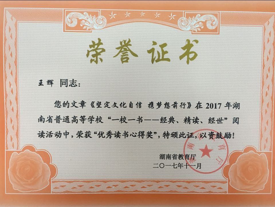 本网讯 日前,在湖南省教育厅主办的2017年全省普通高校“一校一书”阅读推广活动中,vwin德赢图书馆推送的汉文1503班王辉同学和营销1502班梁慧萍两位同学的作品喜获“优秀读书心得奖”。