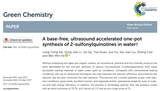 本网讯 近期,vwin德赢化学与生物工程学院有机化学博士团队在超声清洗机用于绿色有机合成反应方面取得重要进展,研究成果被Green Chemistry (影响因子:9.125)刊发。这是该研究团队成立后,在该期刊发表的第三篇学术论文。