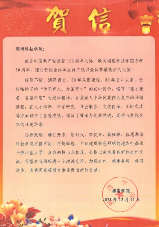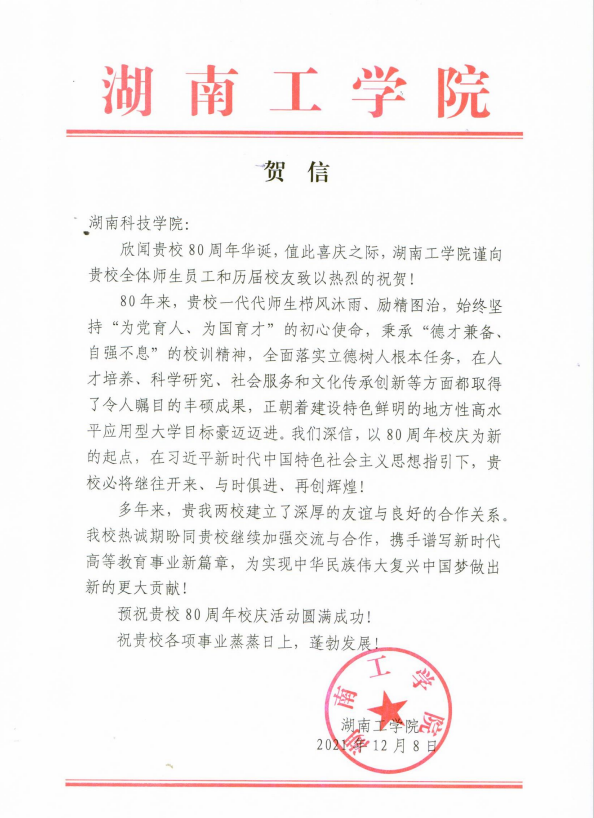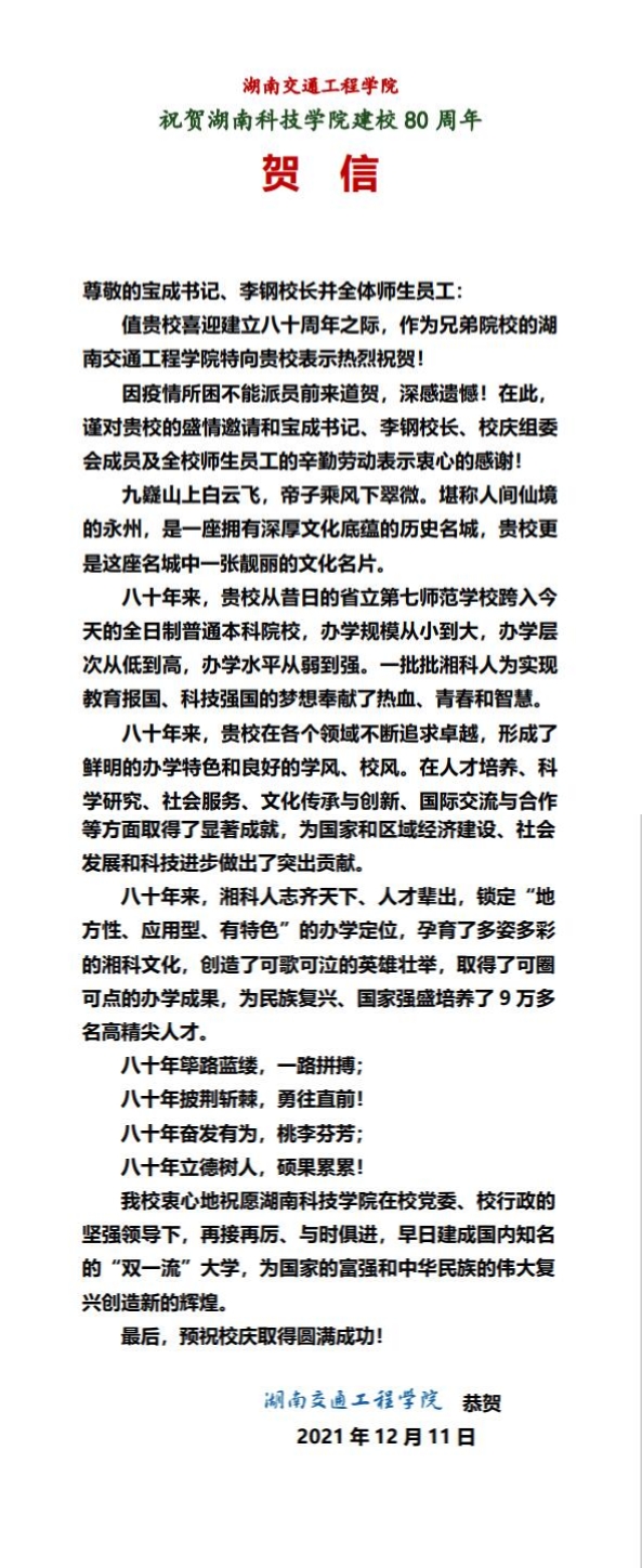 编者按:风雨兼程百十载,弦歌不辍奏华章。学校即将迎来80周年校庆,期间,学校收到大量单位、团体的贺信贺词贺电。在此对部分贺信做一集锦,以表感谢!(排序不分先后)