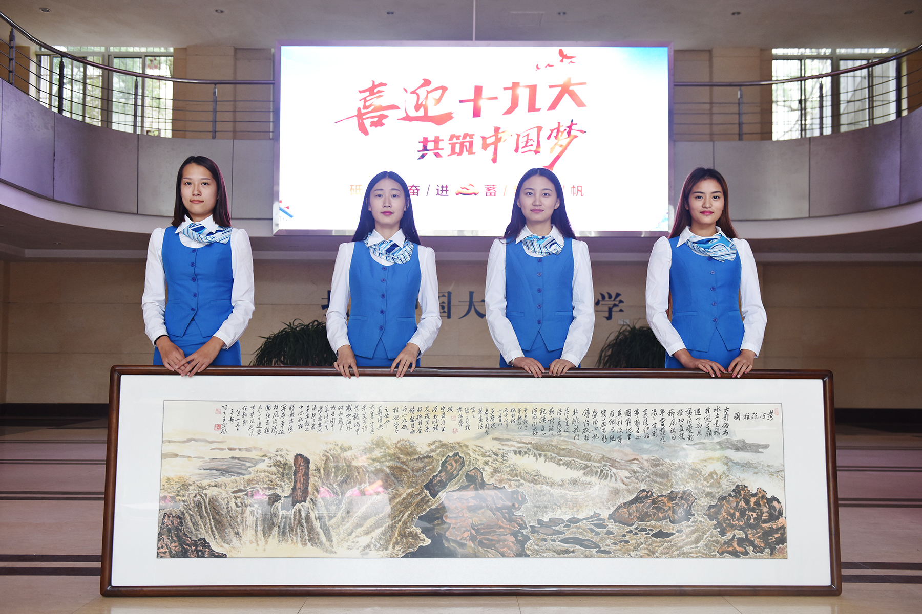 据介绍,这幅长2.8米,宽1米的巨幅画作由vwin德赢退休教师王田葵教授历时近半年时间创作完成。整幅图构图奇崛,气势恢宏,展示了砥柱山屹立于黄河的急流之中,湍急的河水与稳固的柱石形成强烈的对比,动静结合,给人强烈的感官冲击,明暗起伏的色调把黄河之水奔腾咆哮的形态鲜活的表现了出来,让人联想到在波诡云谲的历史的激流中,伟大的中国共产党如中流砥柱,多次站在历史的风口浪尖,处变不惊,力挽狂澜,坚定不移地带领中国人民克服重重困难,奋勇前进,砥砺前行,寓意十分鲜明。