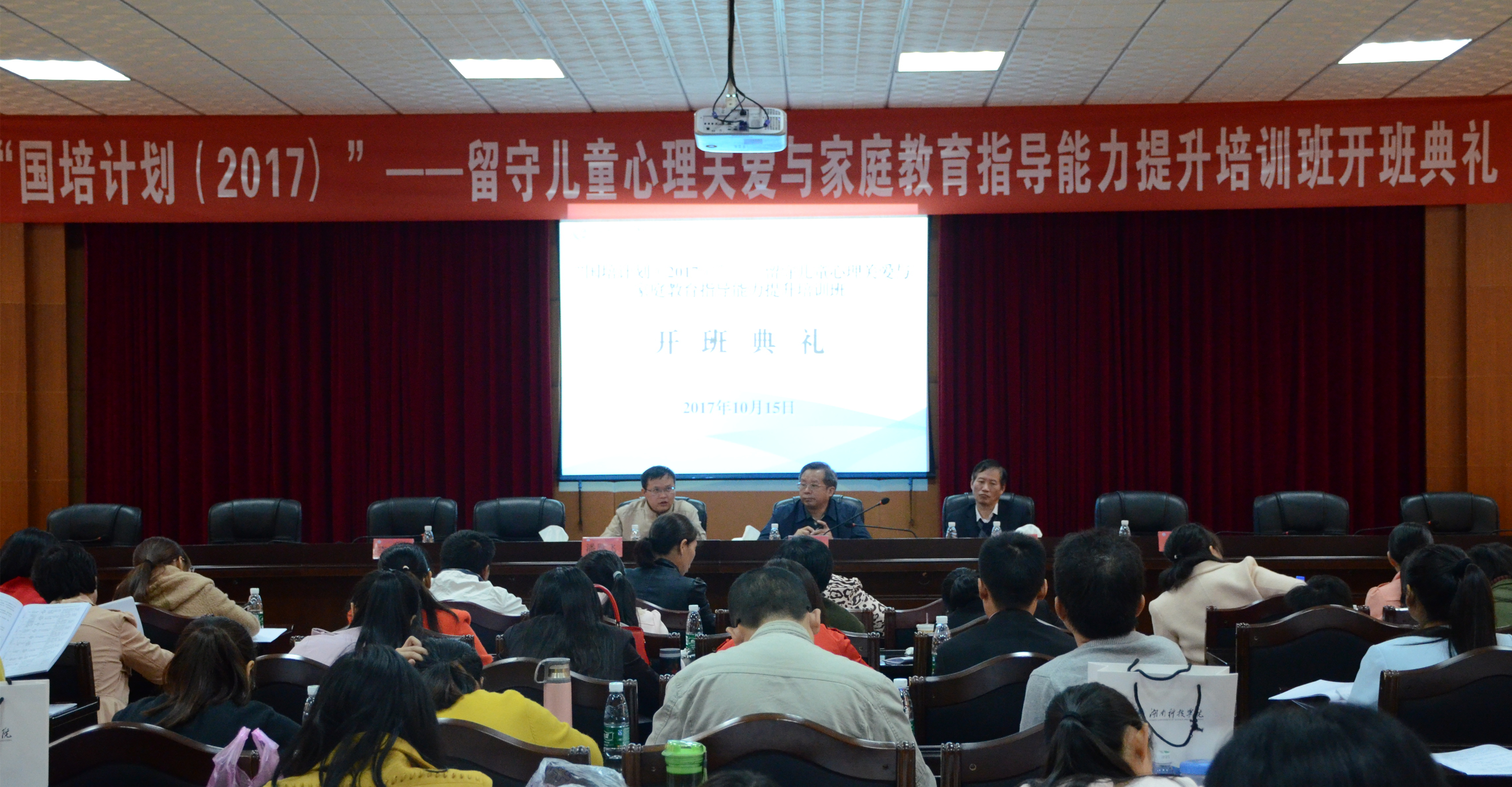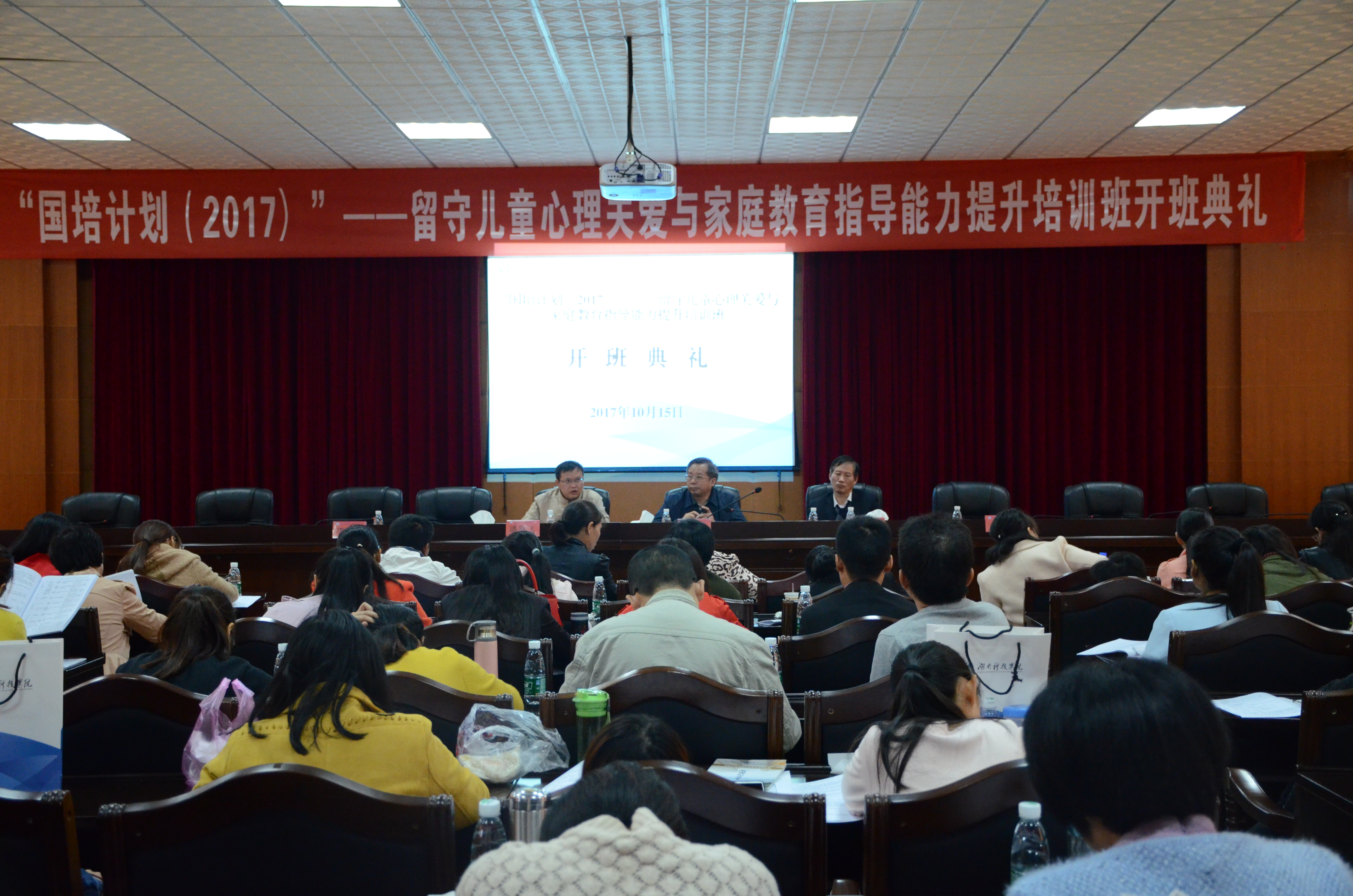 本网讯 10月15日,国培计划(2017)“留守儿童心理关爱与家庭教育指导能力提升”培训班开班典礼在行政楼八楼一会议室举行,副校长郑山明出席本次开班典礼。人文与社会科学学院院长潘雁飞主持开班典礼。