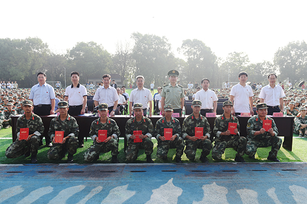 本网讯 9月30日上午,2017级新生军训总结表彰大会暨开学典礼在田径场举行。校党委副书记、校长曾宝成,党委委员、副校长宋宏福、李常健、程智开,武警永州政治处副主任谭杨亮出席。