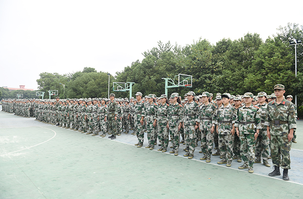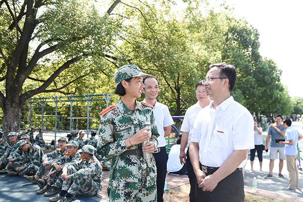 陈弘来到文化广场,看到同学们整齐划一地进行正步训练,丝毫不受高温和阳光影响,陈弘对新生们饱满的精神面貌感到欣慰,为正在参加军训的同学们加油鼓劲。