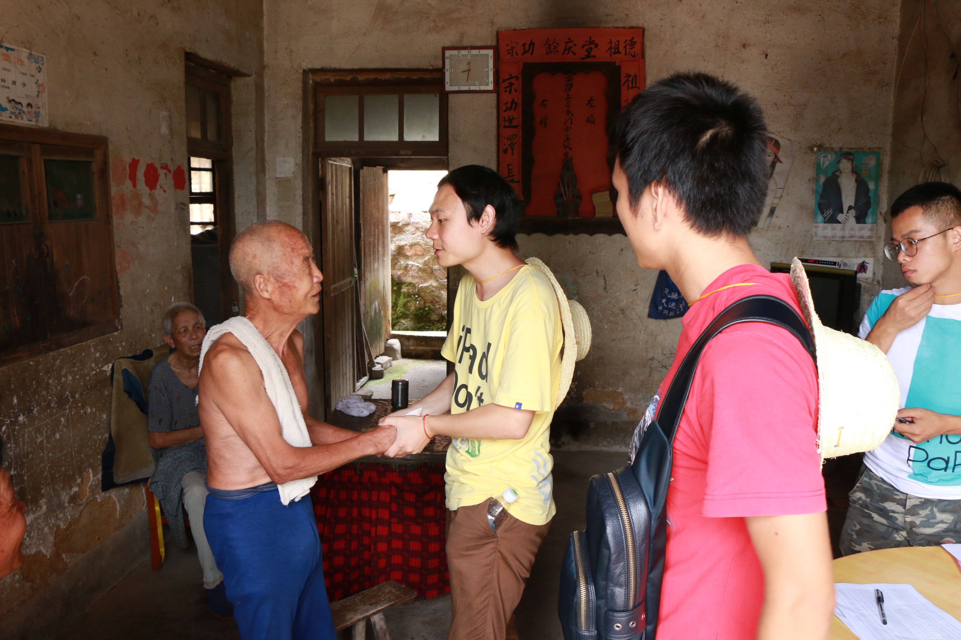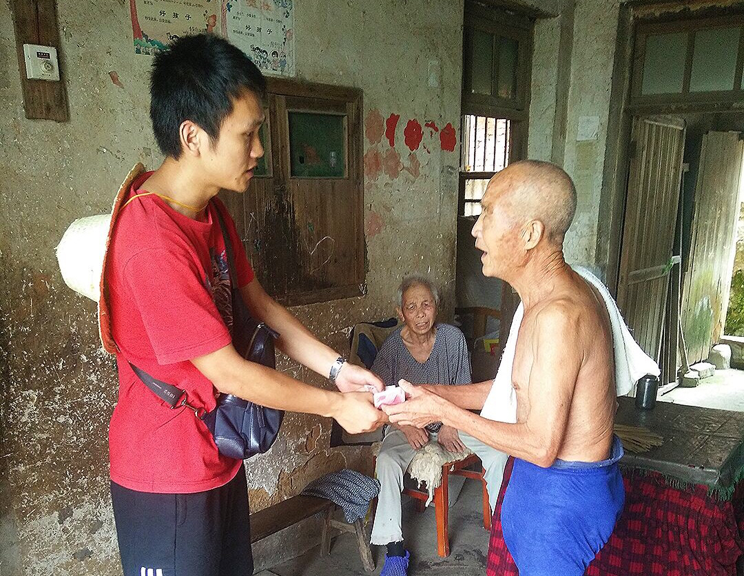 按照新田县扶贫办安排,传媒学院肖可老师和外国语学院陈小峰老师带领的两个工作组深入骥村镇走访调研,在走访李家湾村的贫困户李自怡时,了解到老人早年丧子,两个女儿嫁出去之后,大女儿身体残疾,二女儿的丈夫又有精神疾病,两家均没有能力照顾两位老人,而他的老伴身体也有残疾,生活不能自理,家中的生活来源主要靠社会养老金和老伴的残疾补助,生活相当困难。两位老师慷慨解囊,主动献上了自己的一份爱心。
