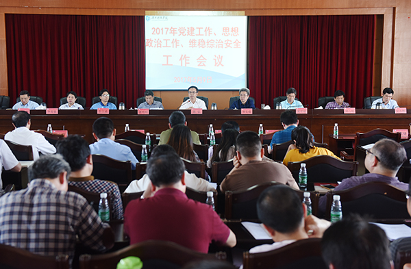 本网讯 5月9日下午,学校召开党建工作、思想政治工作及维稳综治安全工作会议,党委书记陈弘,党委副书记、校长曾宝成,党委副书记唐艳明及校领导宋宏福、彭立威、郑山明、李常健、吴小林、陈仲庚出席会议,会议由唐艳明主持。
