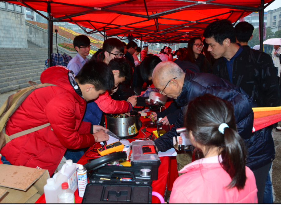 “把自己所学的专业知识义务为居民服务,我们感到很高兴!”淅沥的风雨中,志愿者们互相打气,三顶红帐篷、几把红凳子就构成了他们坚守的阵地。虽说环境简陋,前来送修的居民可不少,桌子上堆满了电脑、电烤炉、收音机、电饭煲等废旧家电。志愿者们各司其责,工作进行得有条不紊,有登记送修信息的,有左右开工,一手电线、一手螺丝刀地维修家电的,还有的贴心地为送修人员遮风挡雨,偶有空闲时间,志愿者们还发放宣传手册,为群众讲解安全用电小常识和家电日常维修方法。